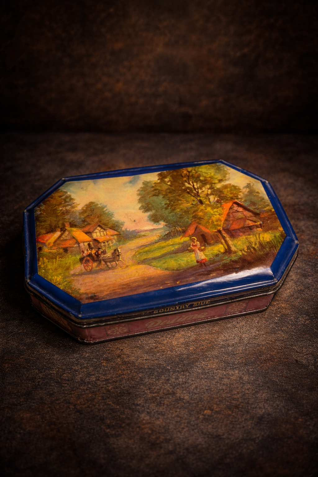 rare and visually stunning Dalima biscuit tin, featuring a beautifully illustrated countryside village scene on the lid.