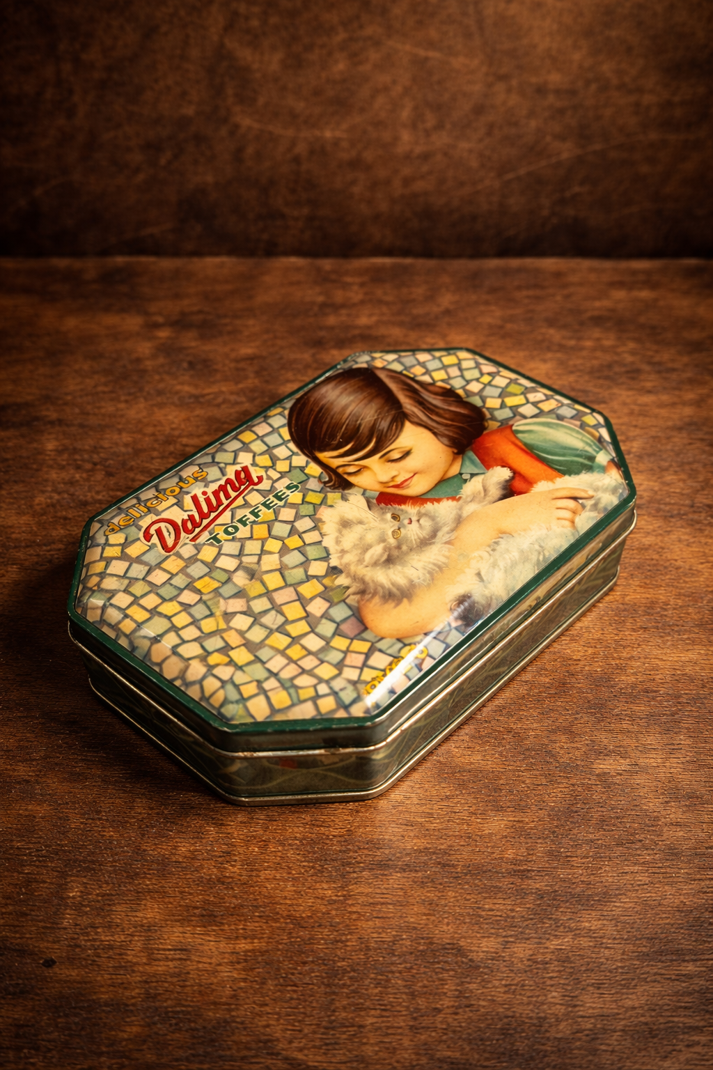 This original vintage Dalina Toffees metal tin is a beautiful example of mid-20th century confectionery packaging. The lid features a charming illustration of a young girl with her cat, creating a nostalgic childhood appeal. The colorful mosaic-style background and retro typography place it in the classic collectible candy tin category.