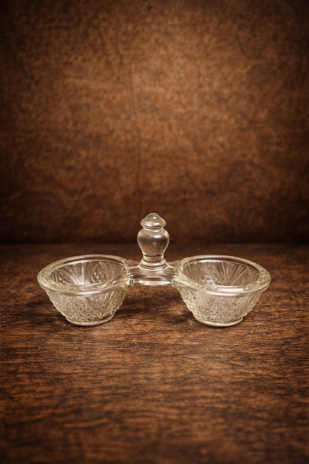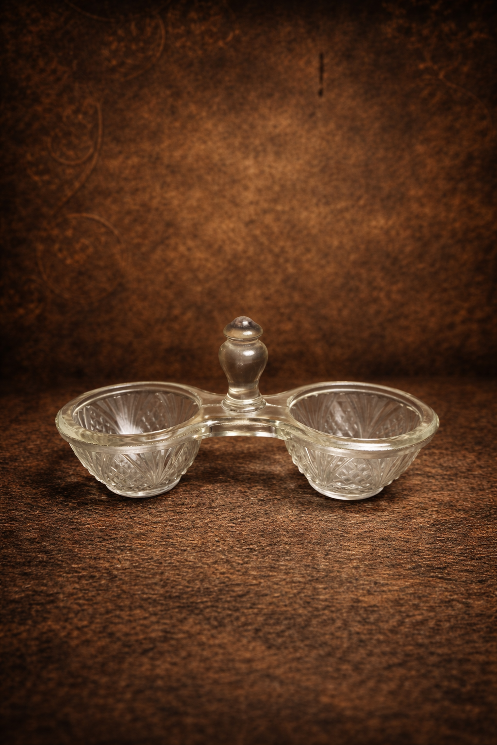 This elegant vintage double bowl server features a clean, minimal design crafted in clear pressed glass. The two bowls are connected by a solid glass handle, giving the piece both functional ease and visual balance. Its simple pressed glass pattern adds a graceful, timeless character. Such glass servers were traditionally used for serving paan, condiments, and small table accompaniments in refined homes and classic dining settings.