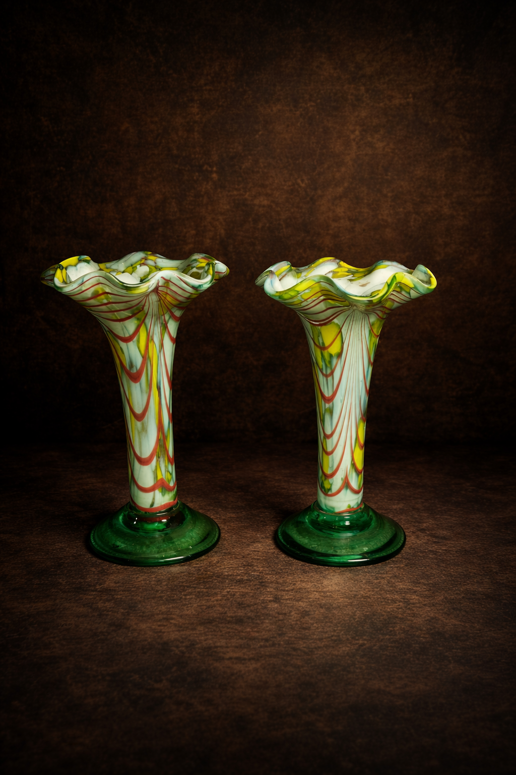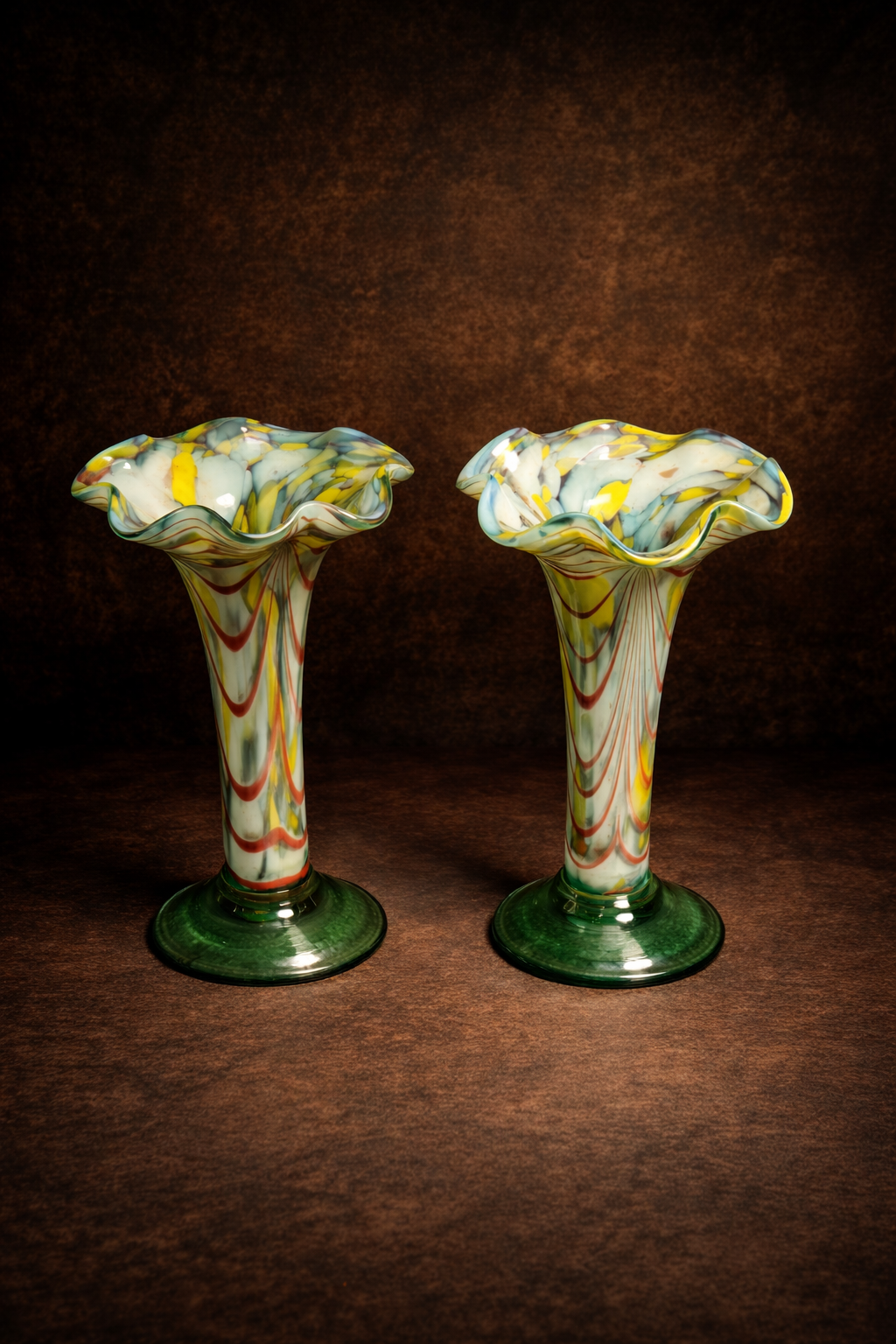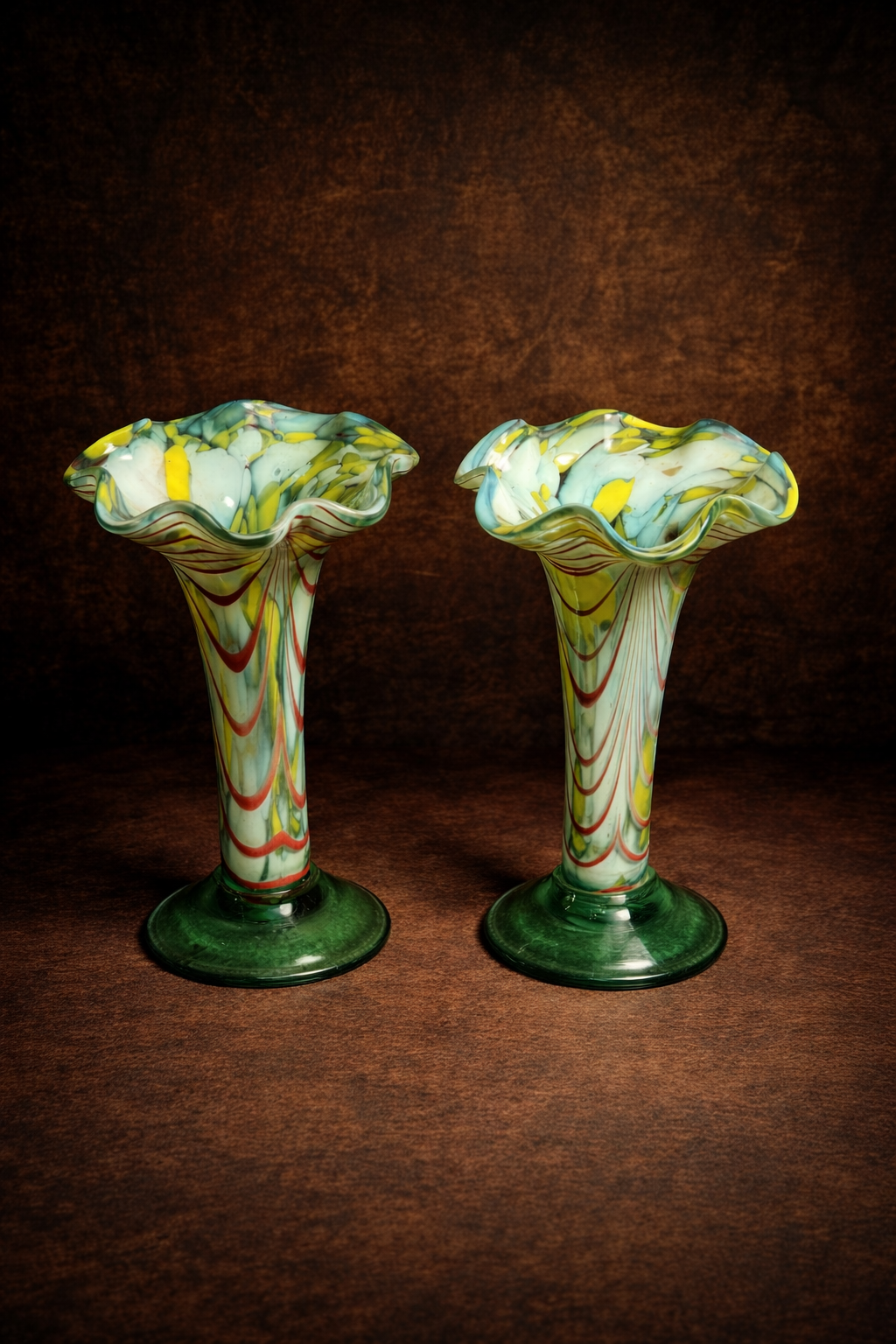 An elegant pair of vintage hand-blown art glass vases, featuring a striking tall silhouette combined with a beautifully ruffled flared rim. These vases are crafted with a unique blend of soft green, yellow, and subtle red swirl patterns, creating a mesmerizing visual effect.
