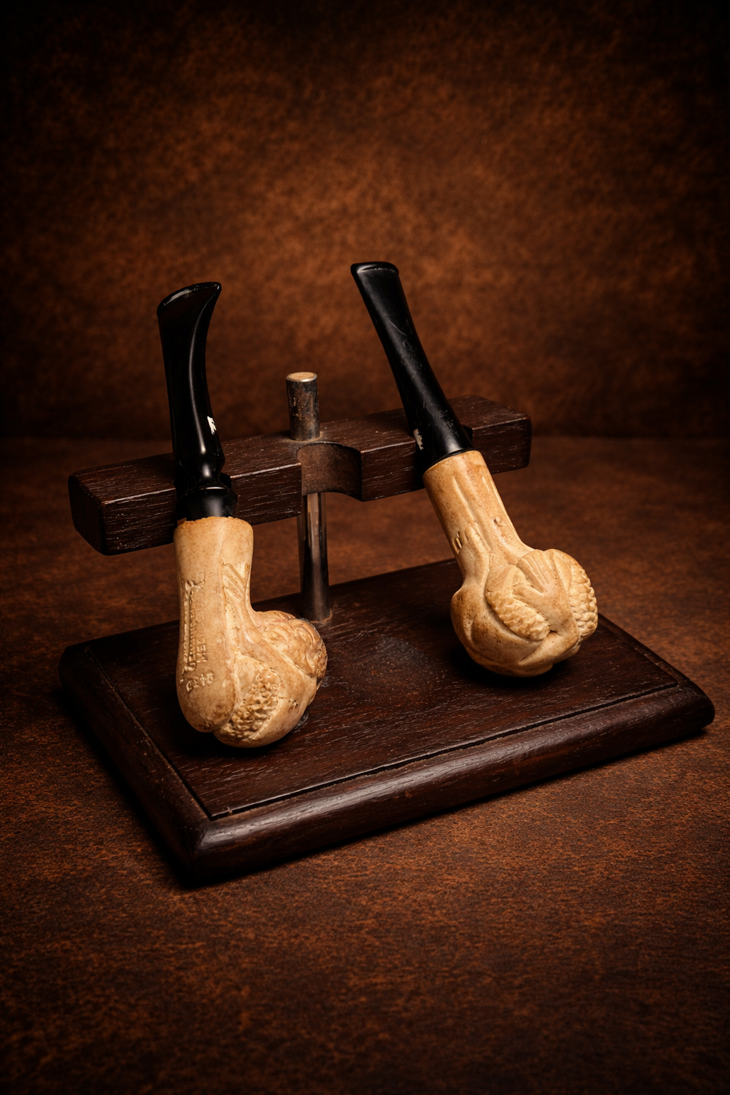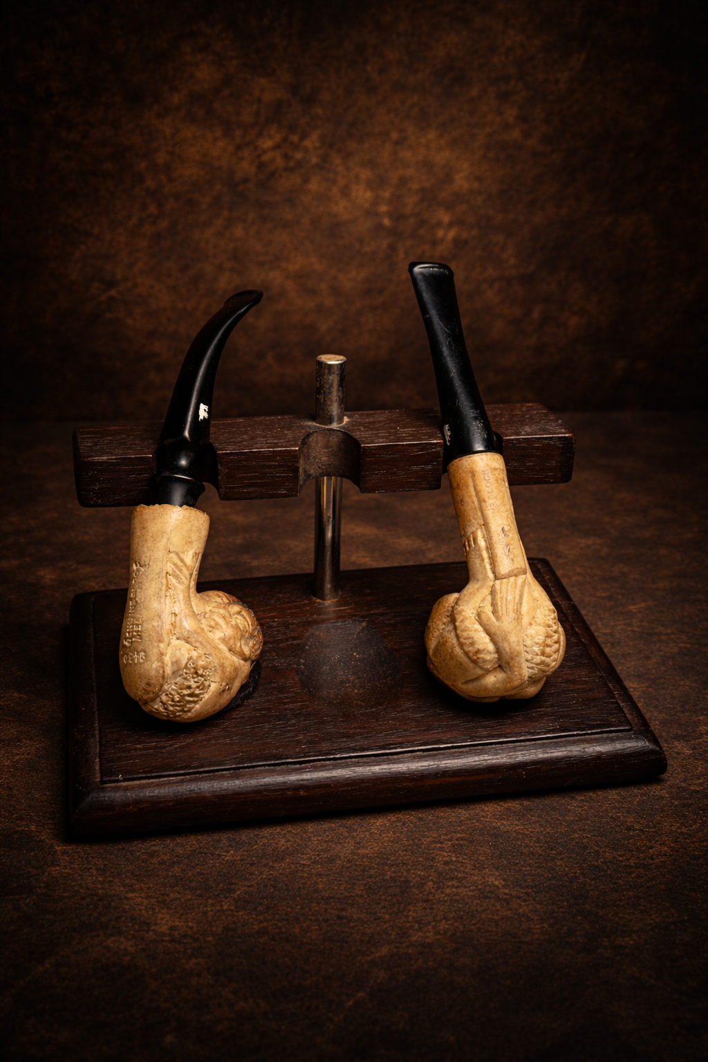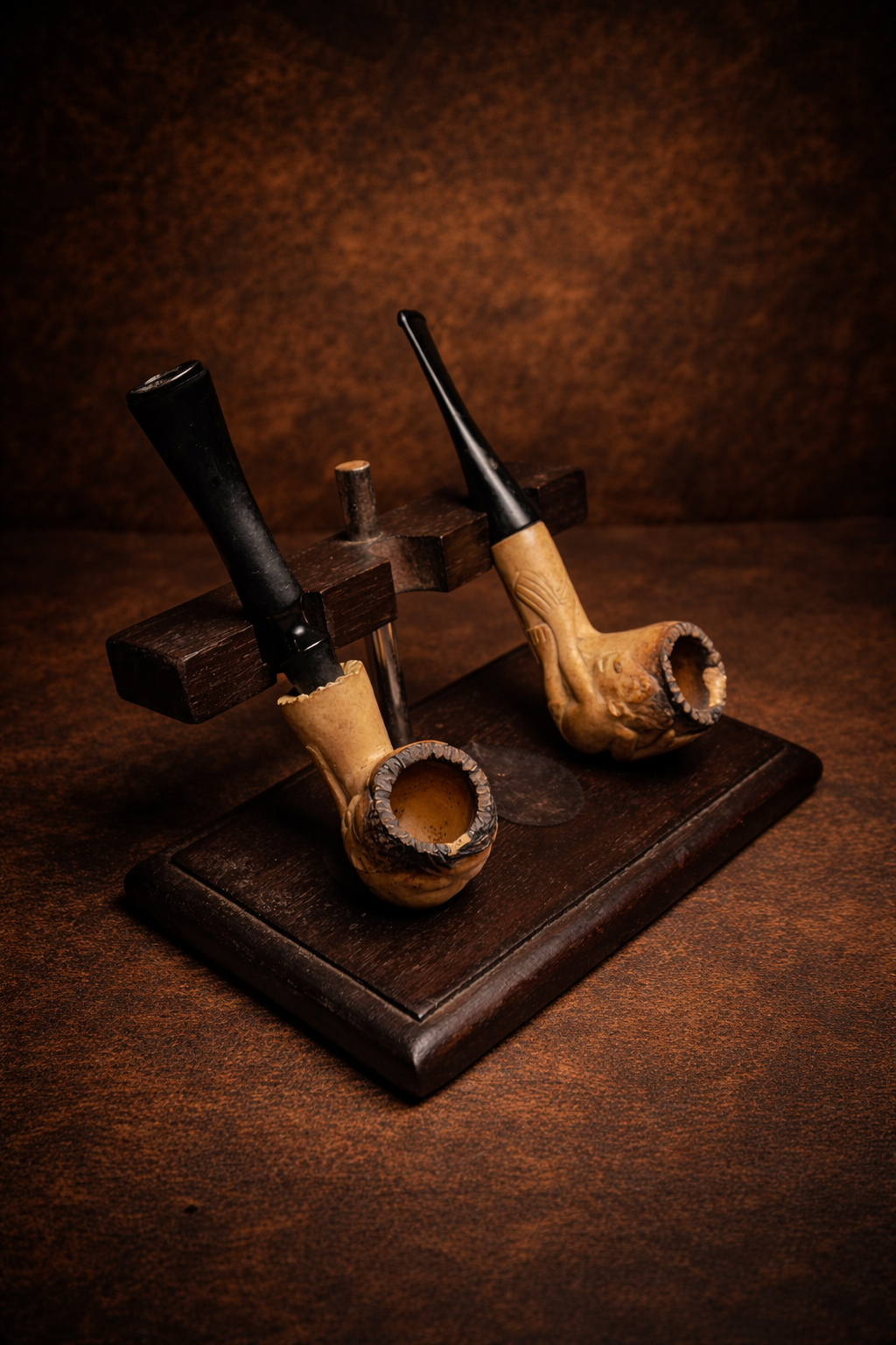 Presenting a rare vintage smoking pipe set, featuring two beautifully crafted pipes along with an original wooden display stand.