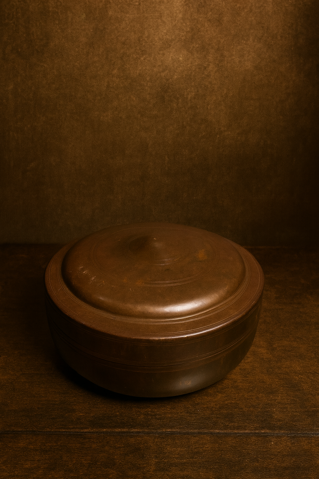 The exterior carries a warm brown patina developed naturally over decades, reflecting its age and authenticity. The inside retains its original metal surface, showcasing its usefulness in household storage.