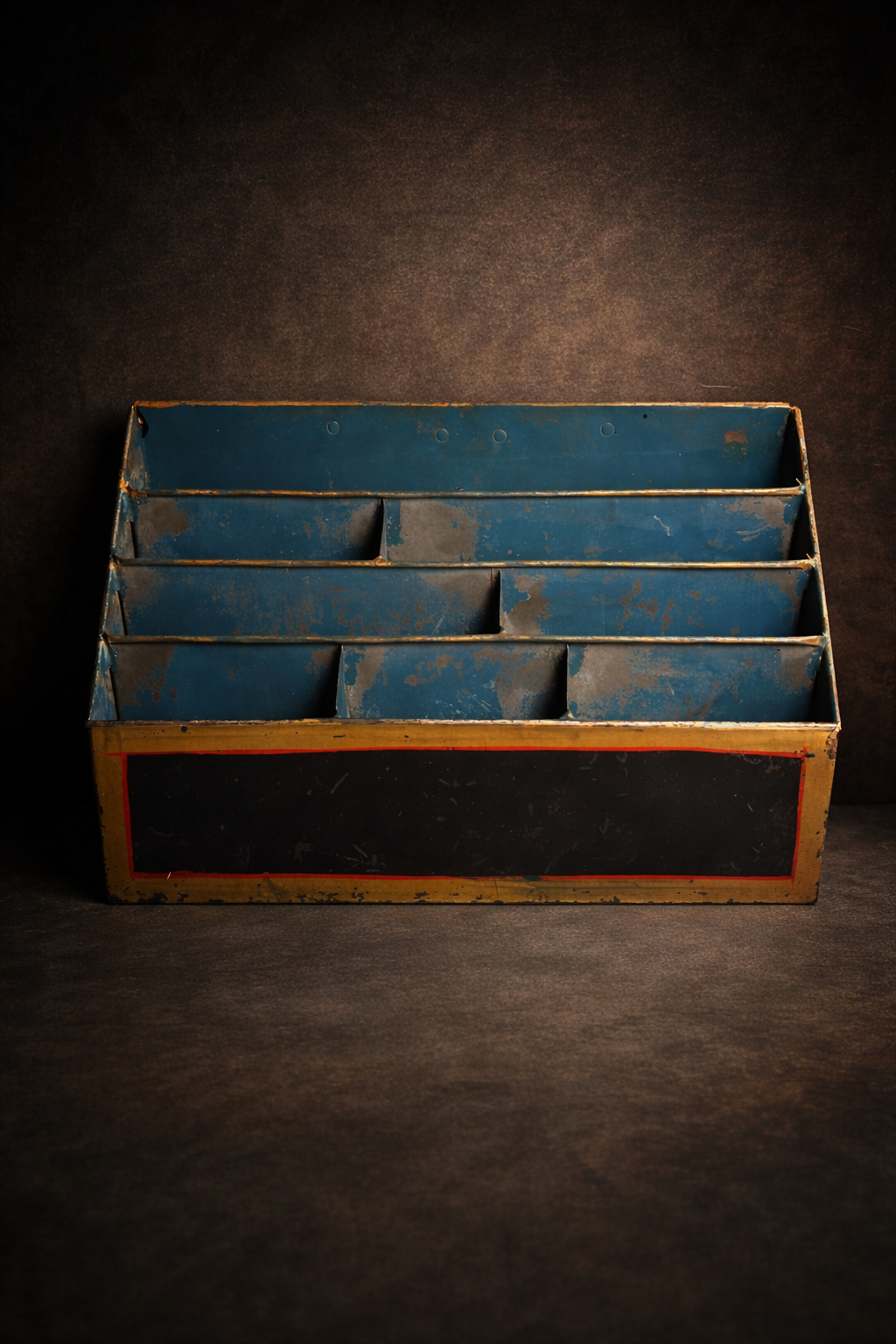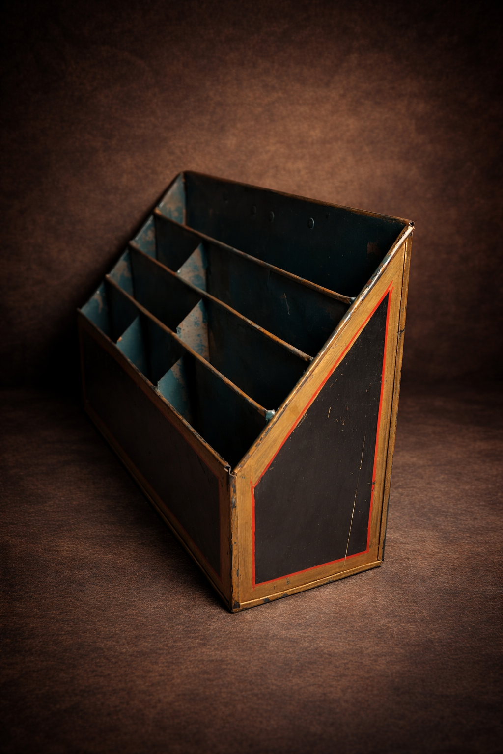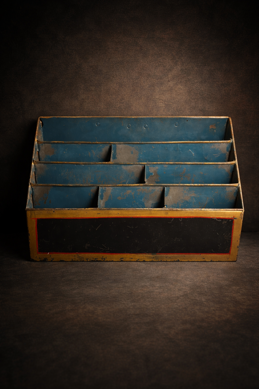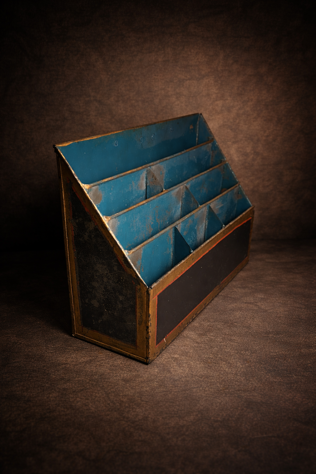 Crafted from solid iron with a slanted multi-slot design, this piece reflects the simplicity and practicality of old-world organization systems. The aged paint and natural patina add a strong authentic vintage industrial charm.
