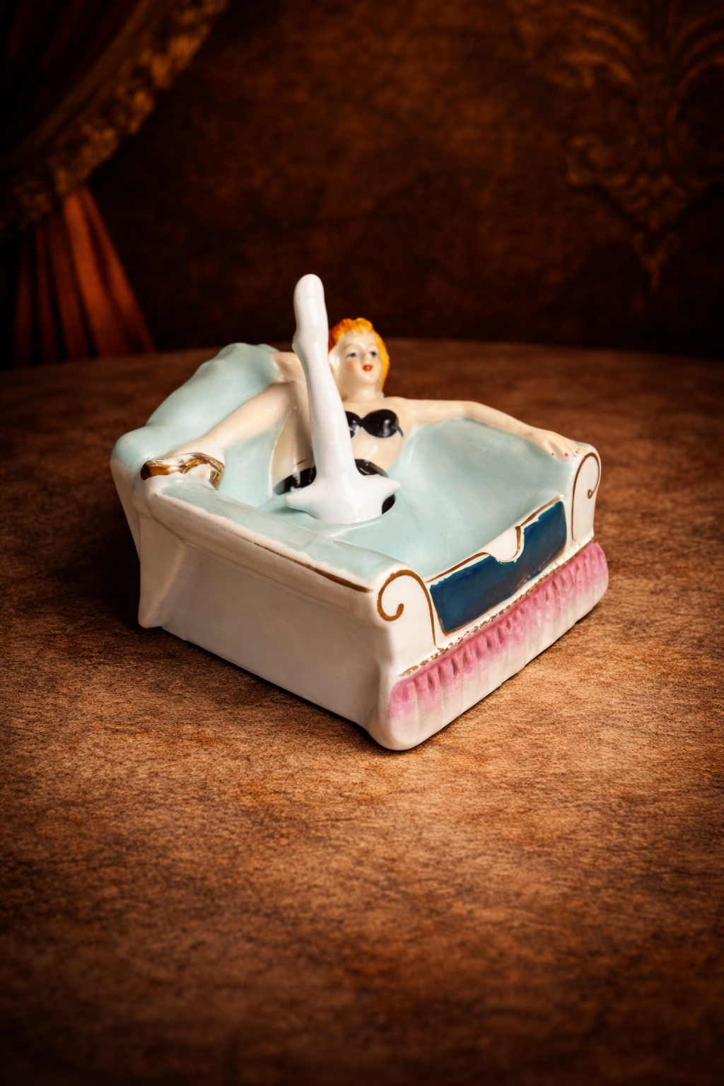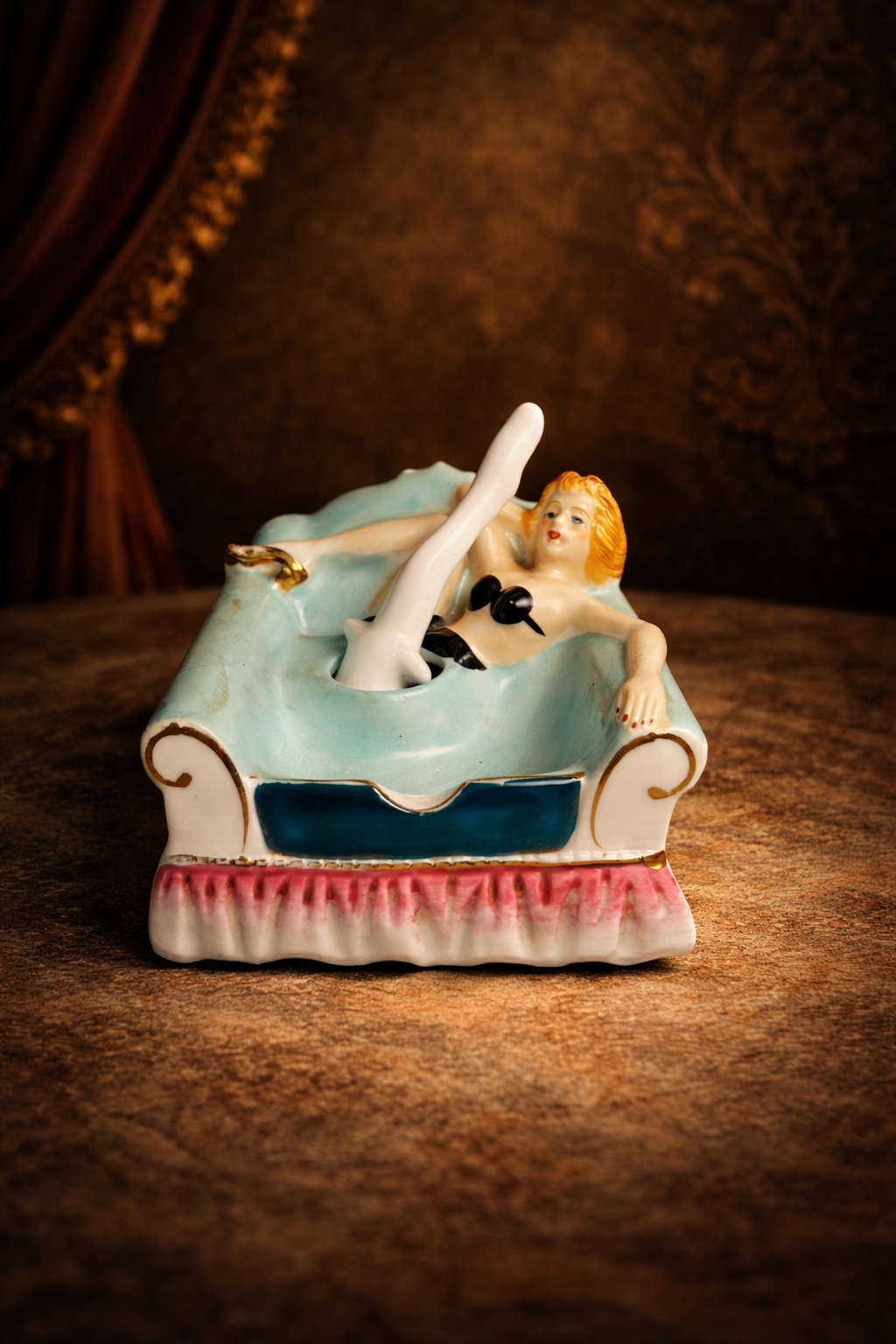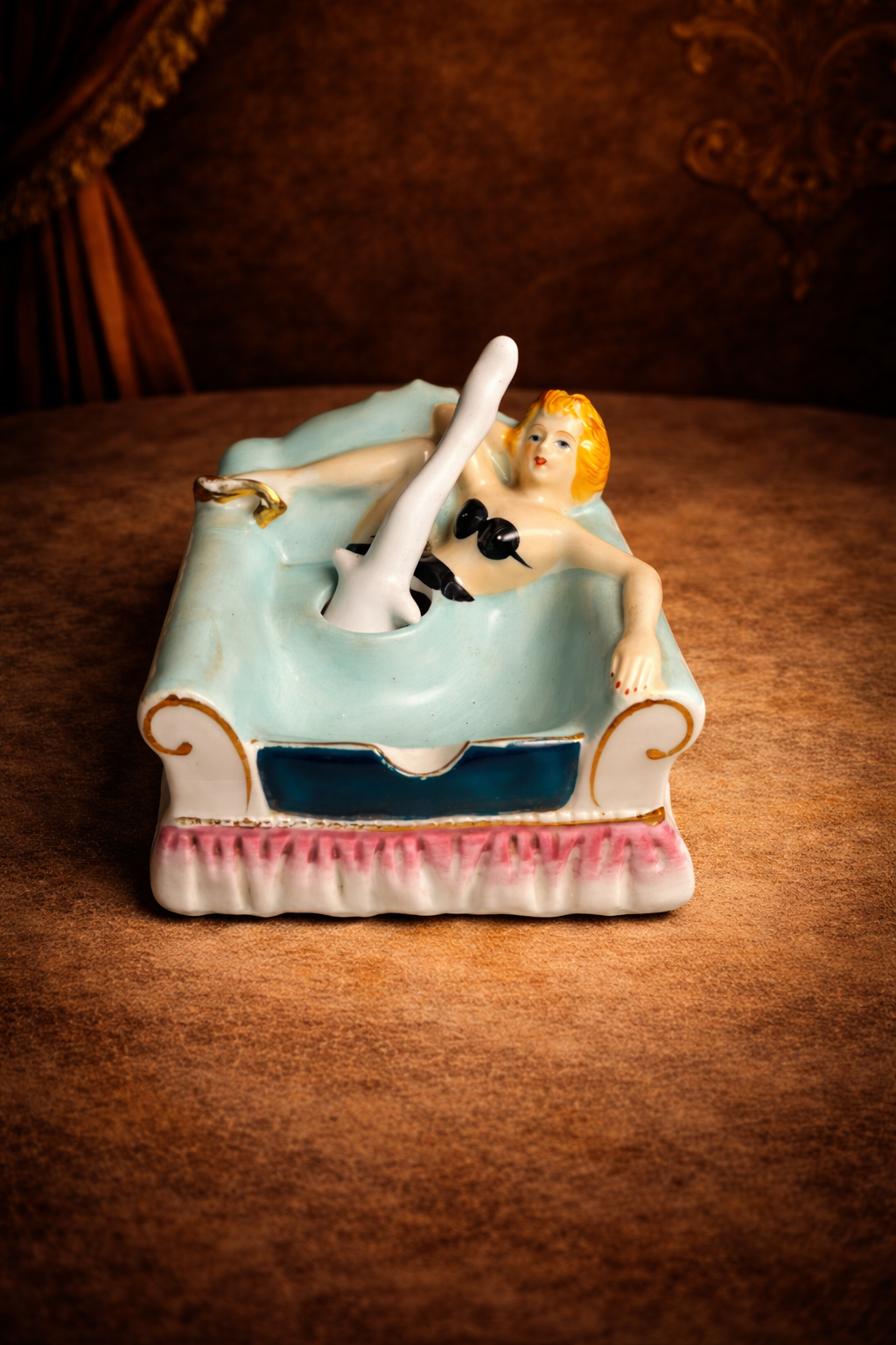 Marked “Made in Japan”, this unique ashtray features a lady reclining on a couch, designed with artistic detailing and a touch of humor. The central holder section was used for placing cigarettes, making it both a functional ashtray and decorative collectible.