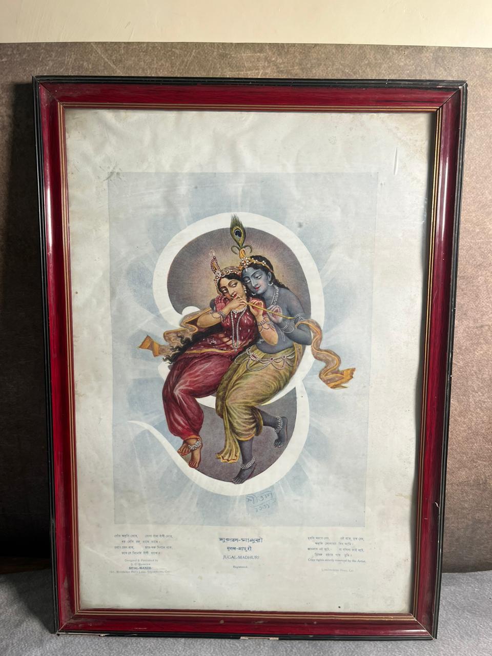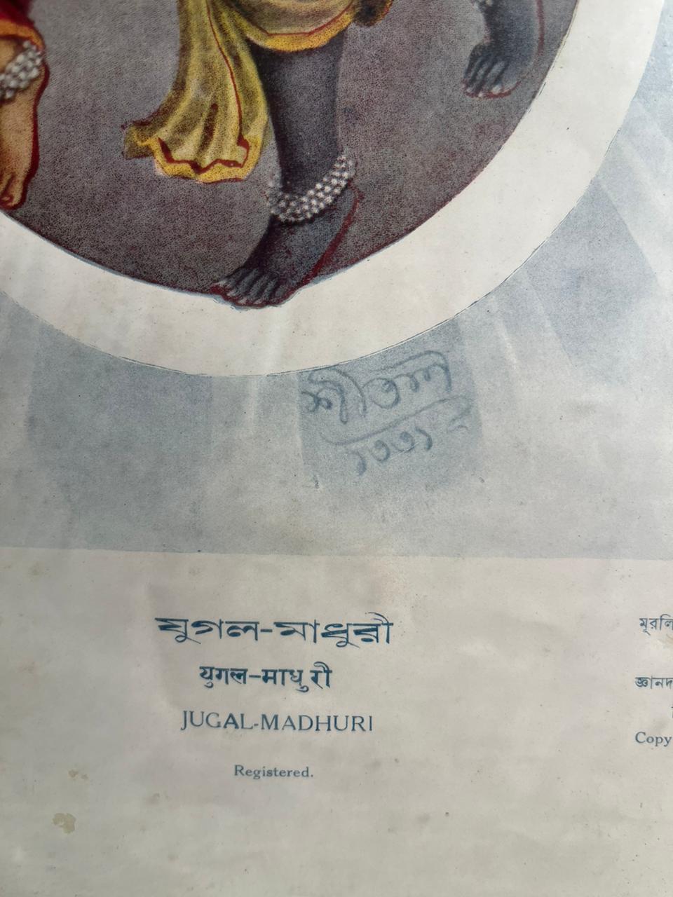 Step into timeless devotion and divine romance with this rare vintage print titled “Jugal Madhuri”, depicting the eternal love of Radha and Krishna. This beautiful artwork captures a serene and intimate moment, where both figures are gracefully seated together, symbolizing harmony, love, and spiritual connection.