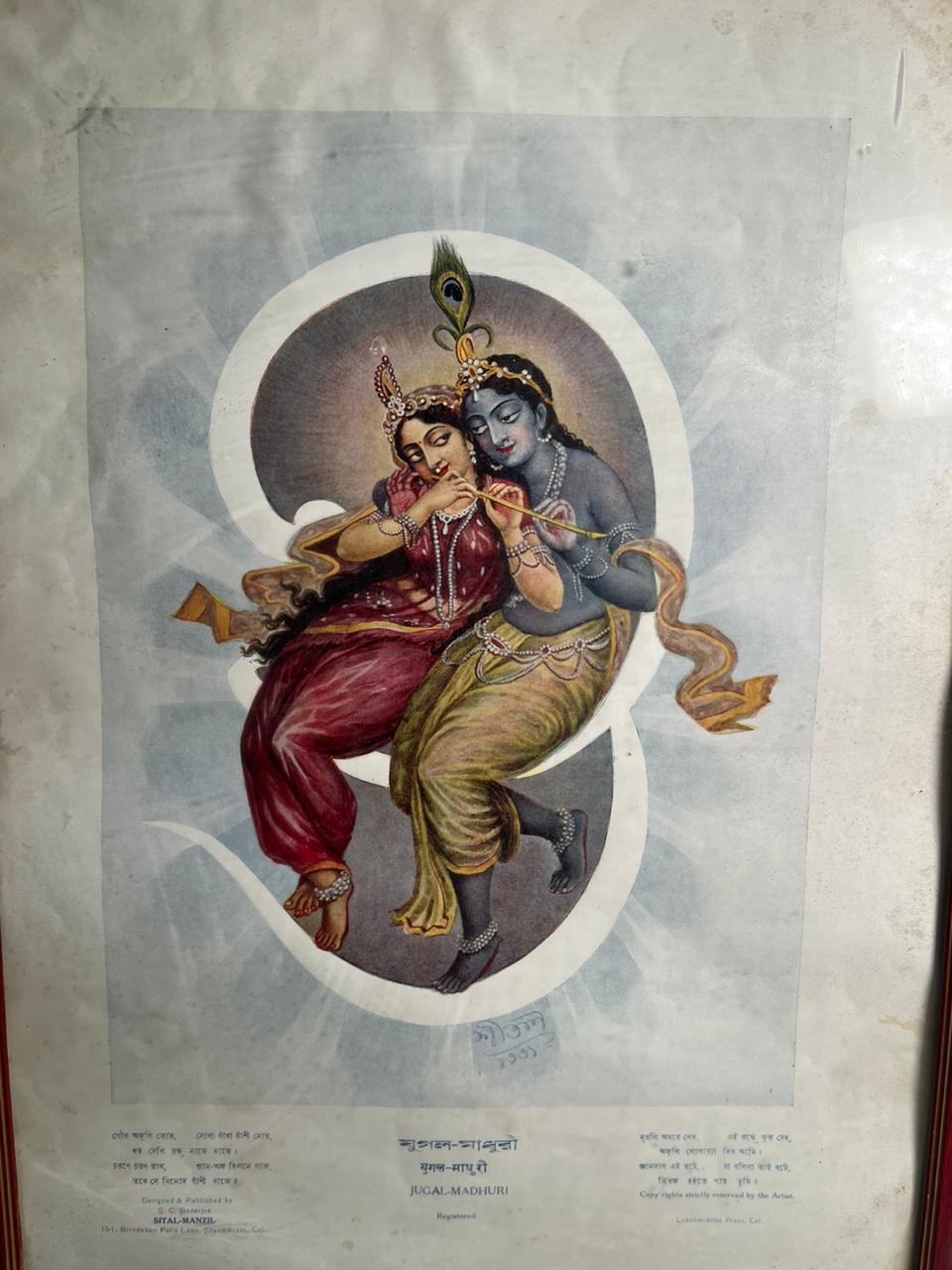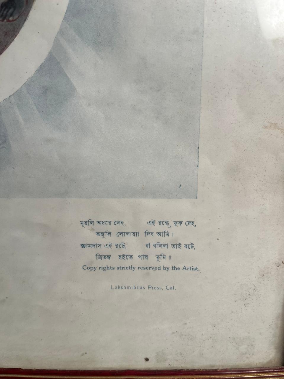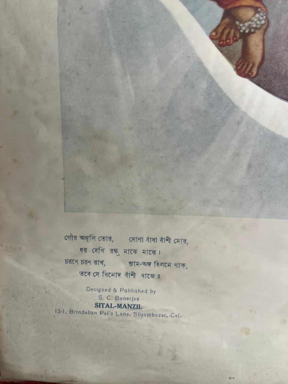 This piece is an old lithograph print, published by Sital-Manzil, Calcutta, and printed at Lakshmibilas Press — making it a highly collectible item from early printmaking era in India. The presence of original Bengali text and publication details further enhances its authenticity and historical value.