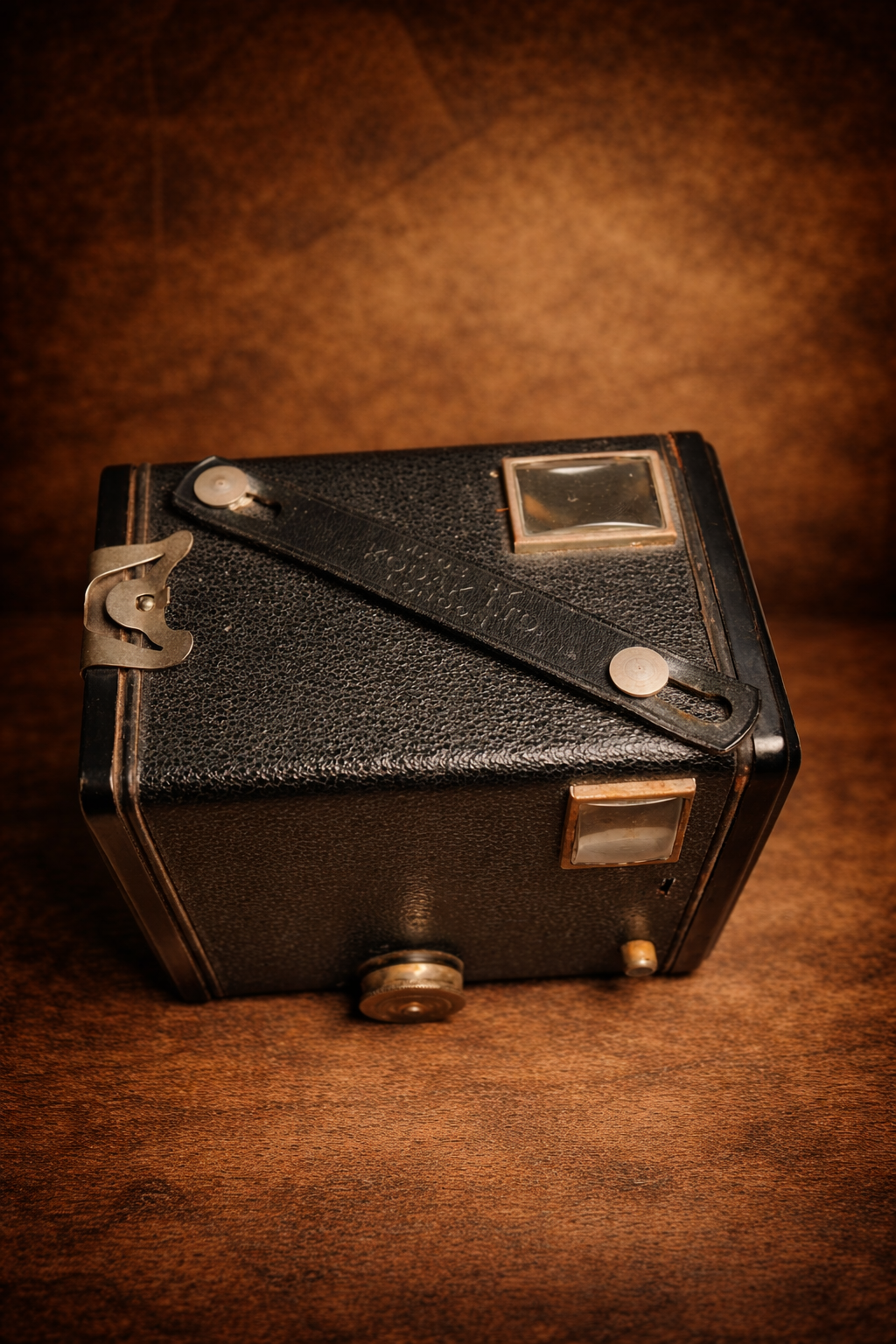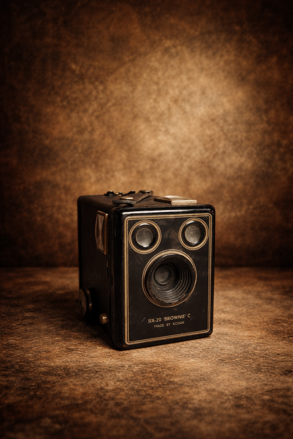 With its distinctive box design, twin viewfinders, and classic metal lens housing, the Brownie C is a timeless collectible. The camera’s textured black body and simple mechanical design beautifully reflect the craftsmanship of vintage photographic equipment.