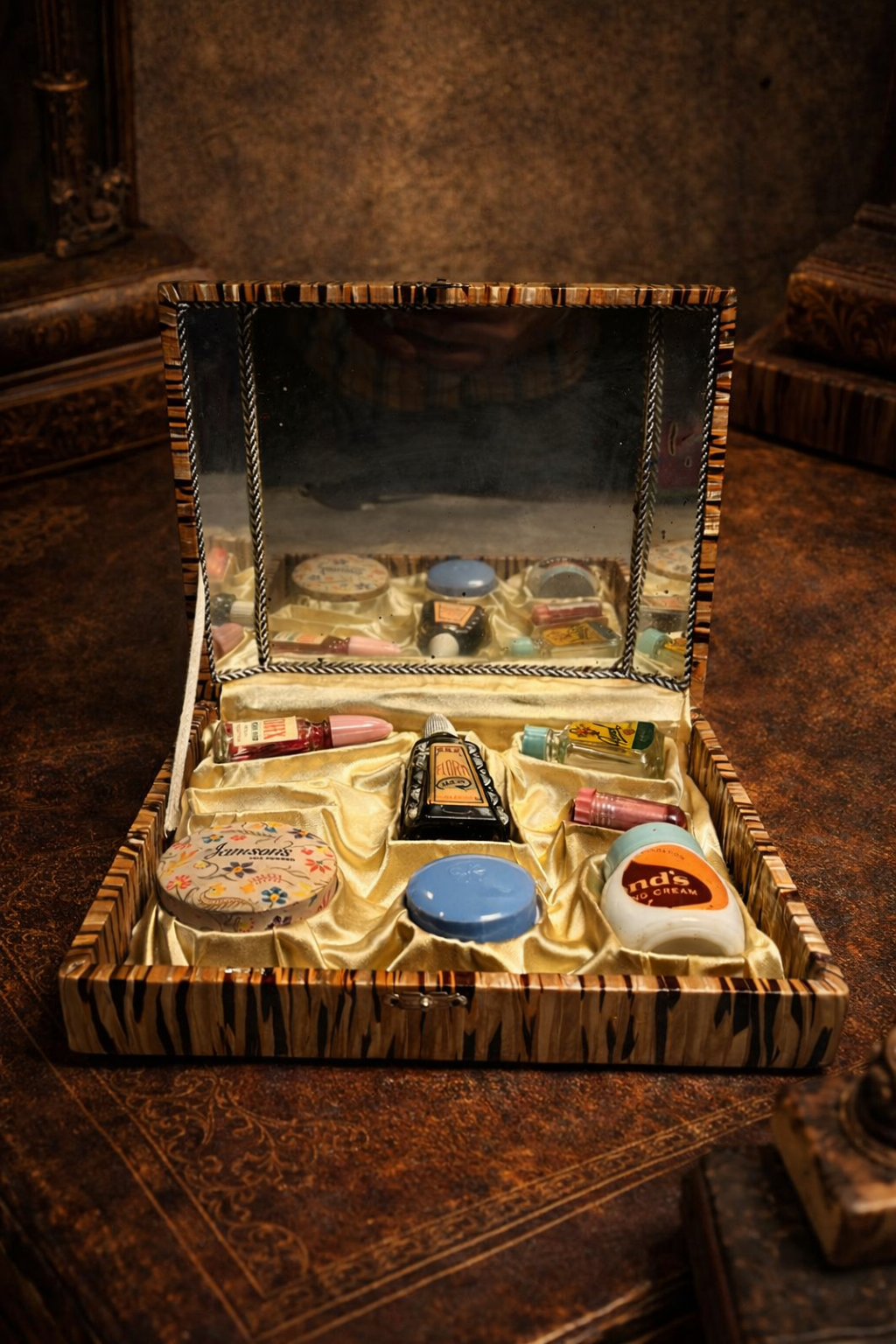 This is an original vintage set. Minor signs of age such as slight wear on satin, marks on mirror, and natural aging of bottles are present, adding to its authenticity.