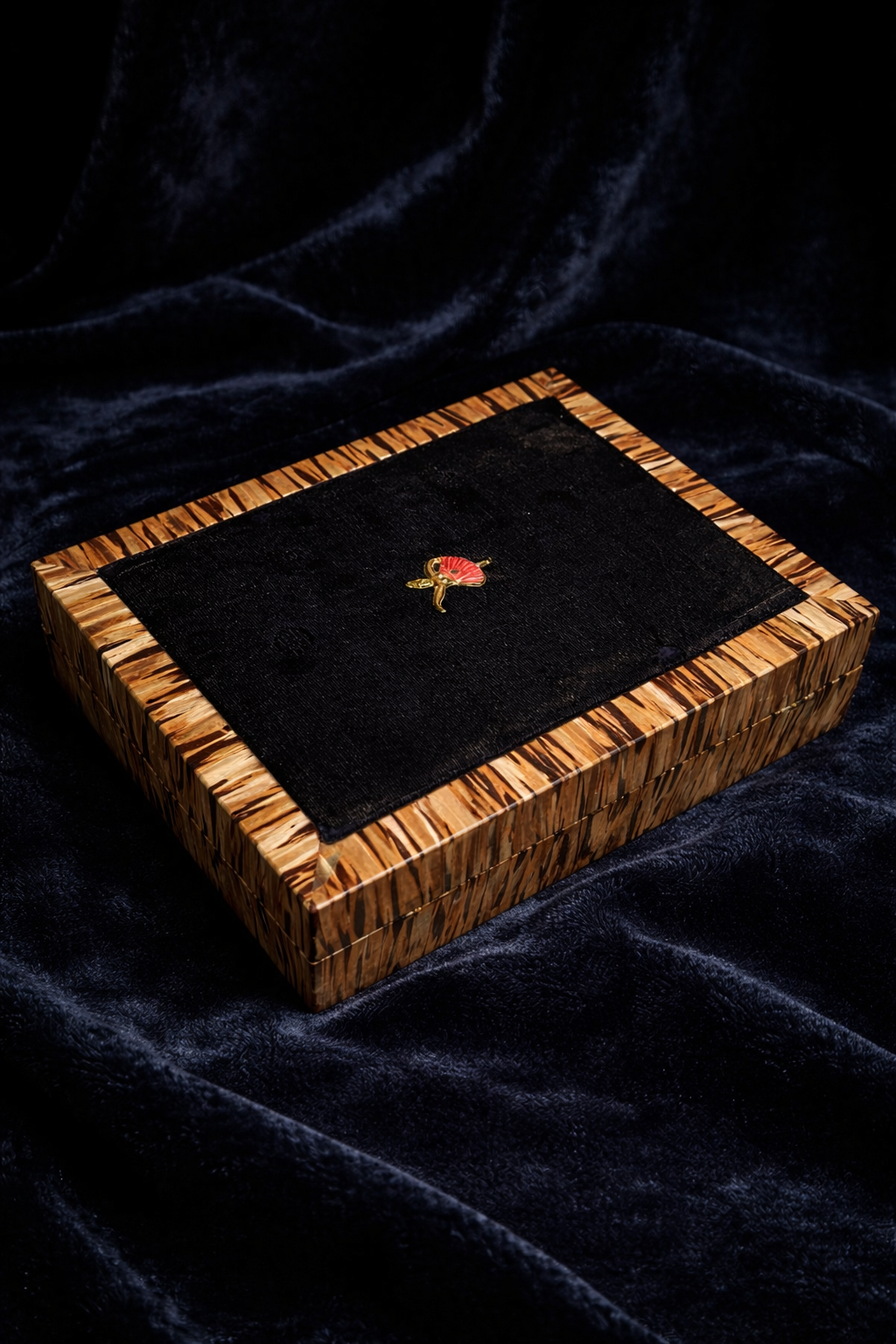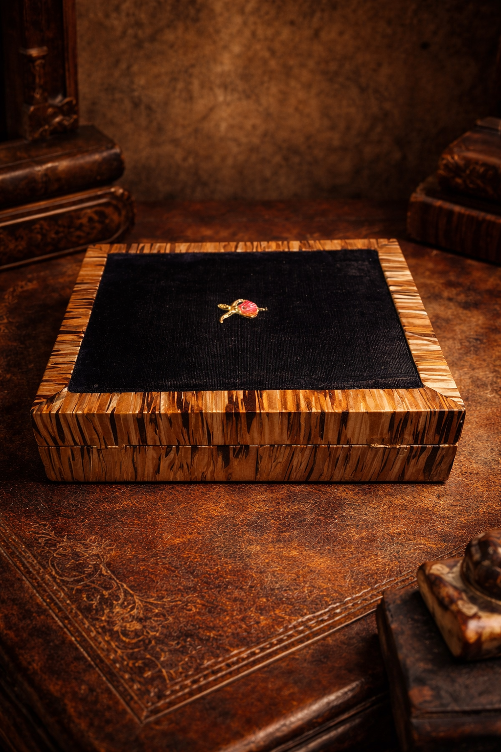 The outer box showcases a unique wood-grain patterned finish, adding a rich vintage aesthetic. This piece reflects the charm of a bygone era when personal grooming sets were crafted with elegance and attention to detail.