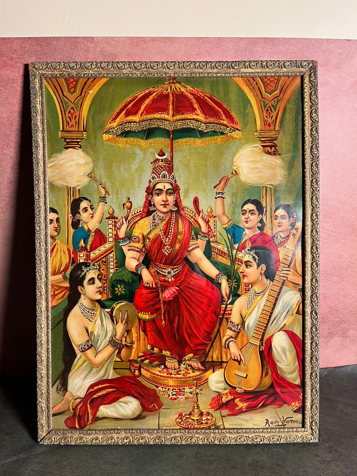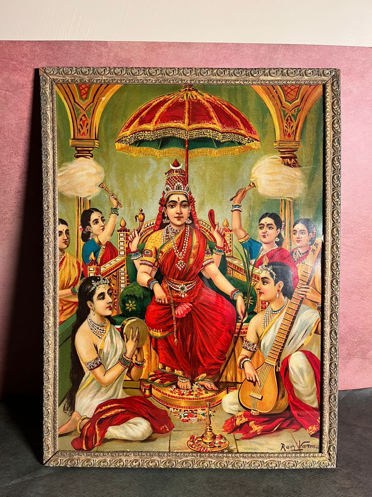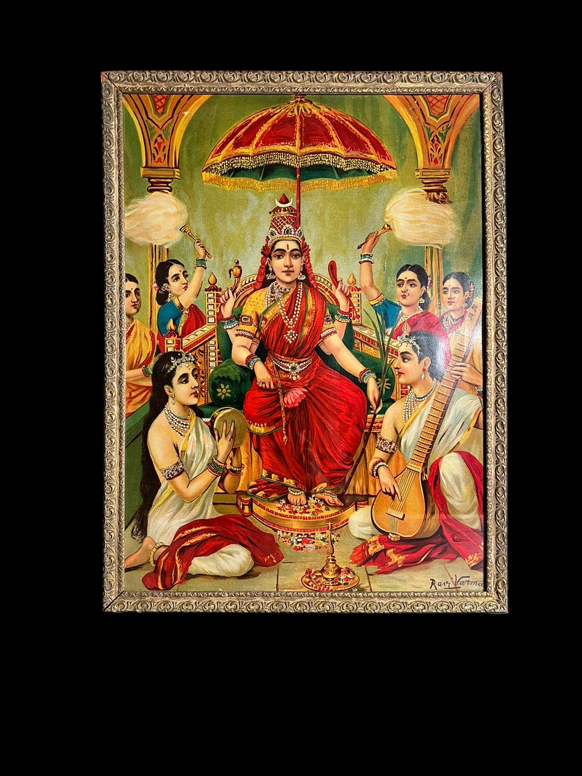 Yeh ek rare vintage oleograph print titled “Ambika” hai, jo renowned Indian artist Raja Ravi Varma ke iconic mythological style ko represent karta hai. Artwork me goddess Ambika ko ek royal throne par baitha hua dikhaya gaya hai, ceremonial chhatra ke niche, attendants aur musicians ke saath — jo divine grace aur shakti ka prateek hai.