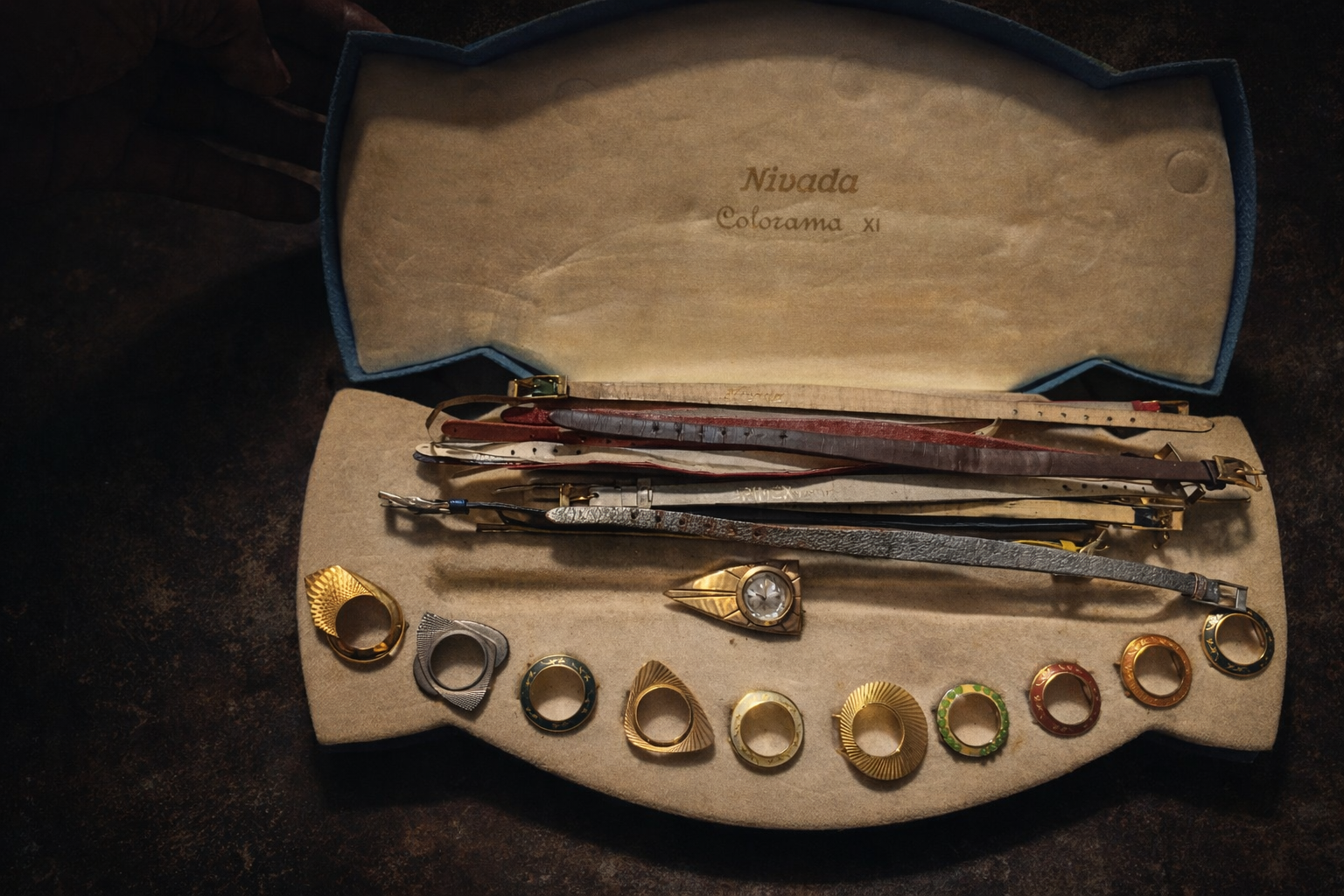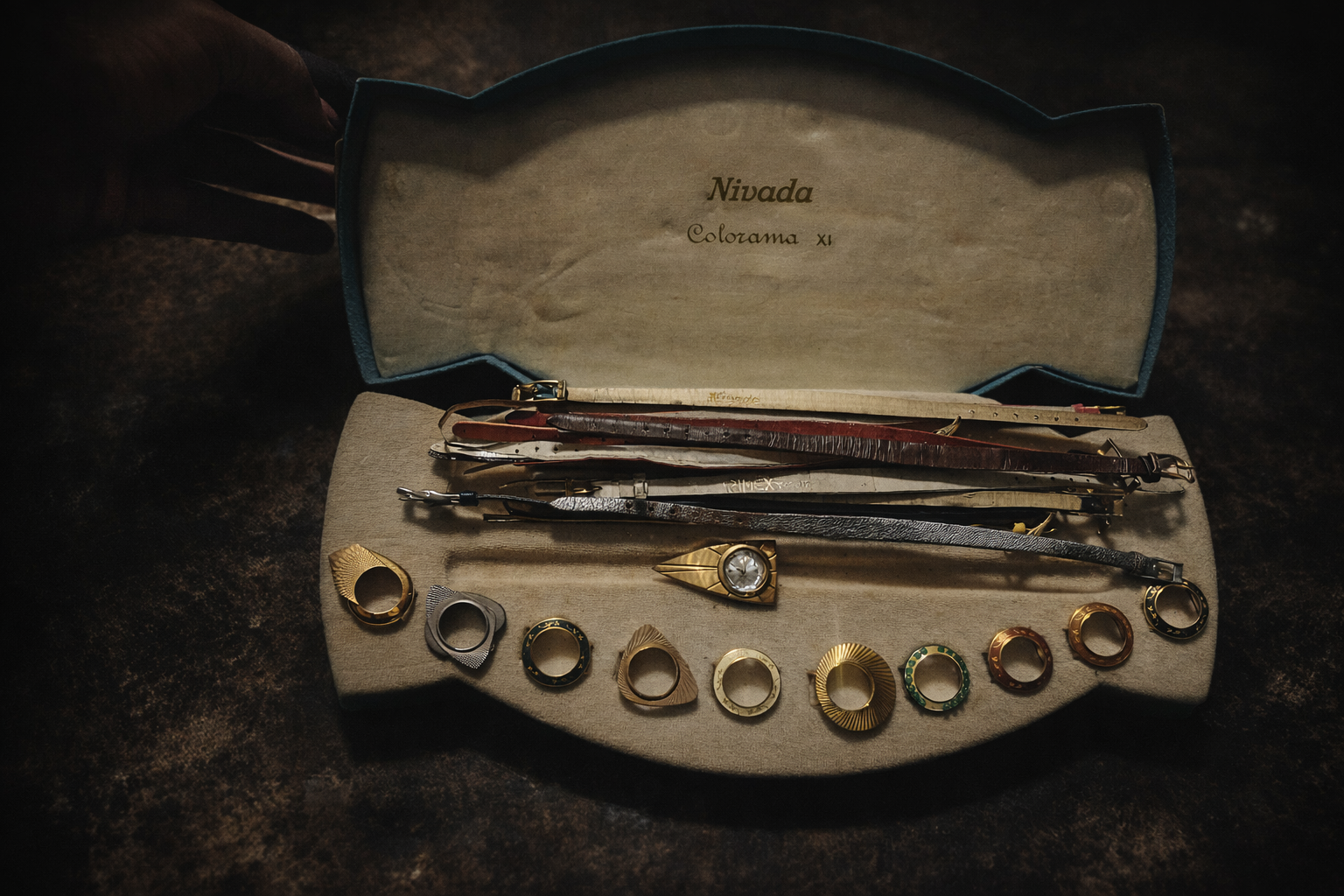 A rare and highly collectible original Nivada Colorama XI presentation set, featuring an assortment of vintage interchangeable watch straps and designer signet rings, beautifully housed in its original branded case.