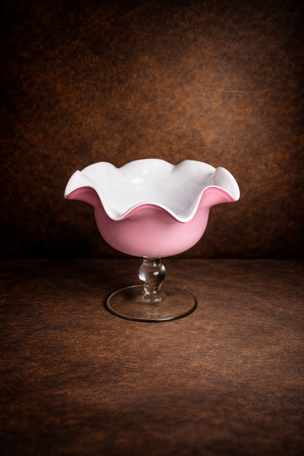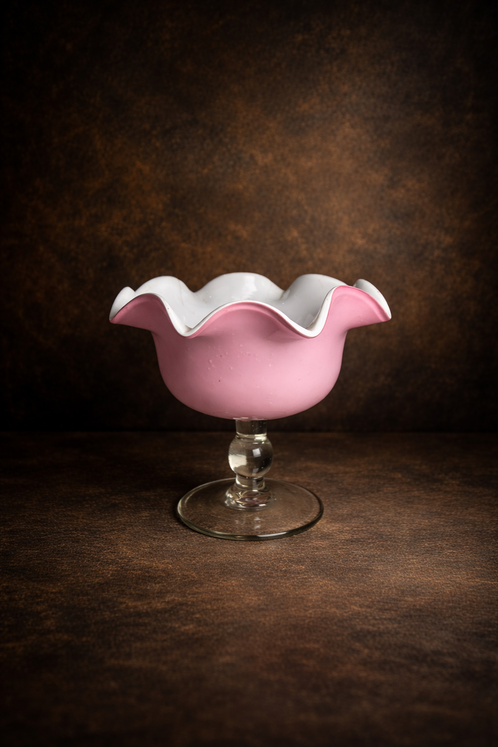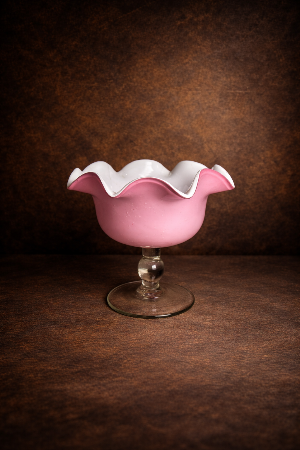 Vintage Opaline Glass Pedestal Bowl – Ruffled Rim (Pink & White)