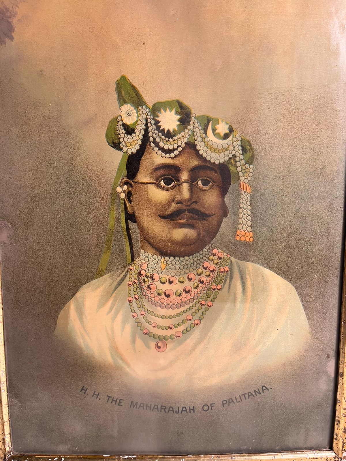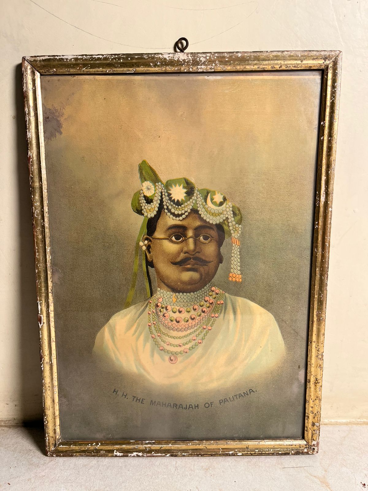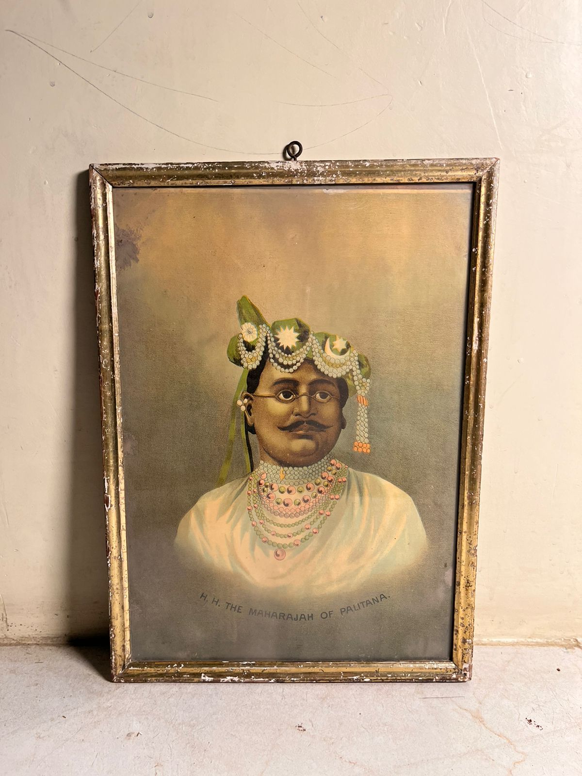 An elegant vintage portrait featuring H.H. The Maharajah of Palitana, beautifully depicted in regal attire adorned with intricate jewelry and a traditional royal turban. The artwork captures the dignity and grandeur of princely India, reflecting the rich heritage of royal culture.