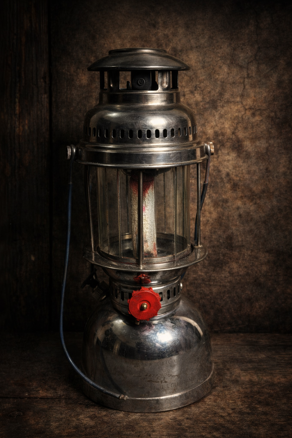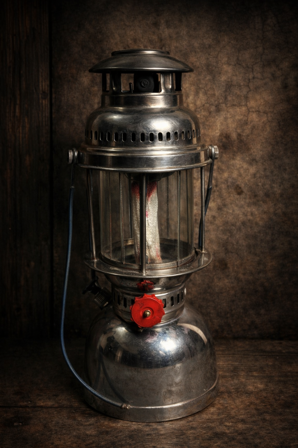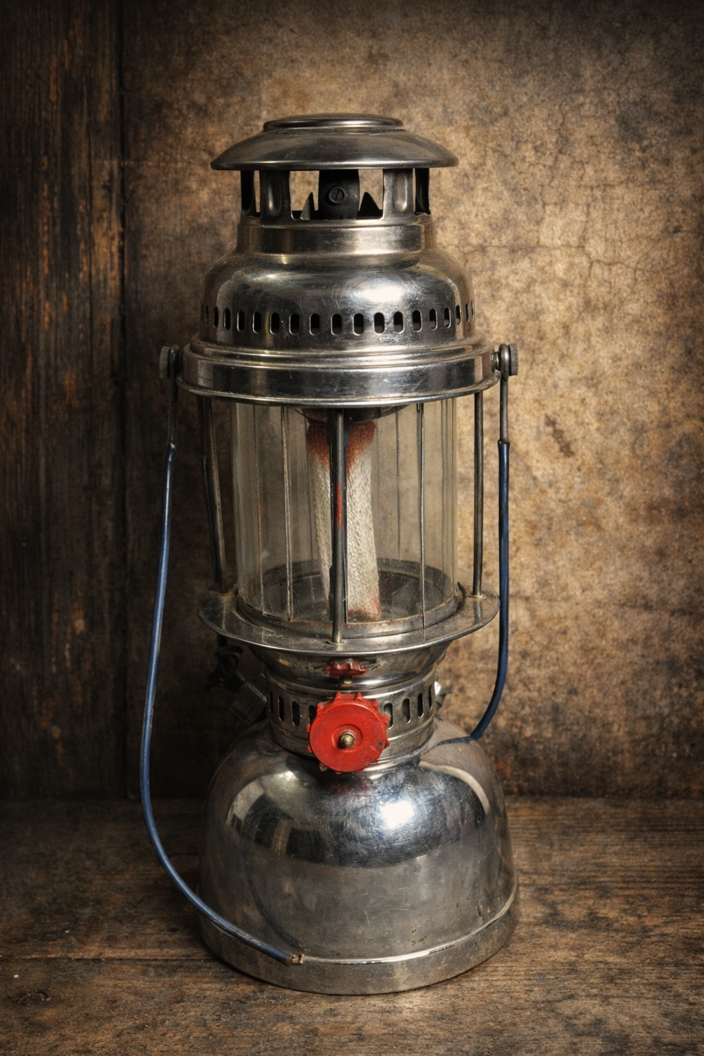 A vintage pressurised kerosene lantern of the Petromax type, historically used as a reliable source of bright light before widespread electrification. These pressure lamps utilise a mantle and hand-pumped fuel reservoir to produce a strong, warm glow, reflecting early engineered lighting solutions. As a collectible, this lantern embodies classic functional design and material heritage valued by enthusiasts of antique lighting and camping paraphernalia.