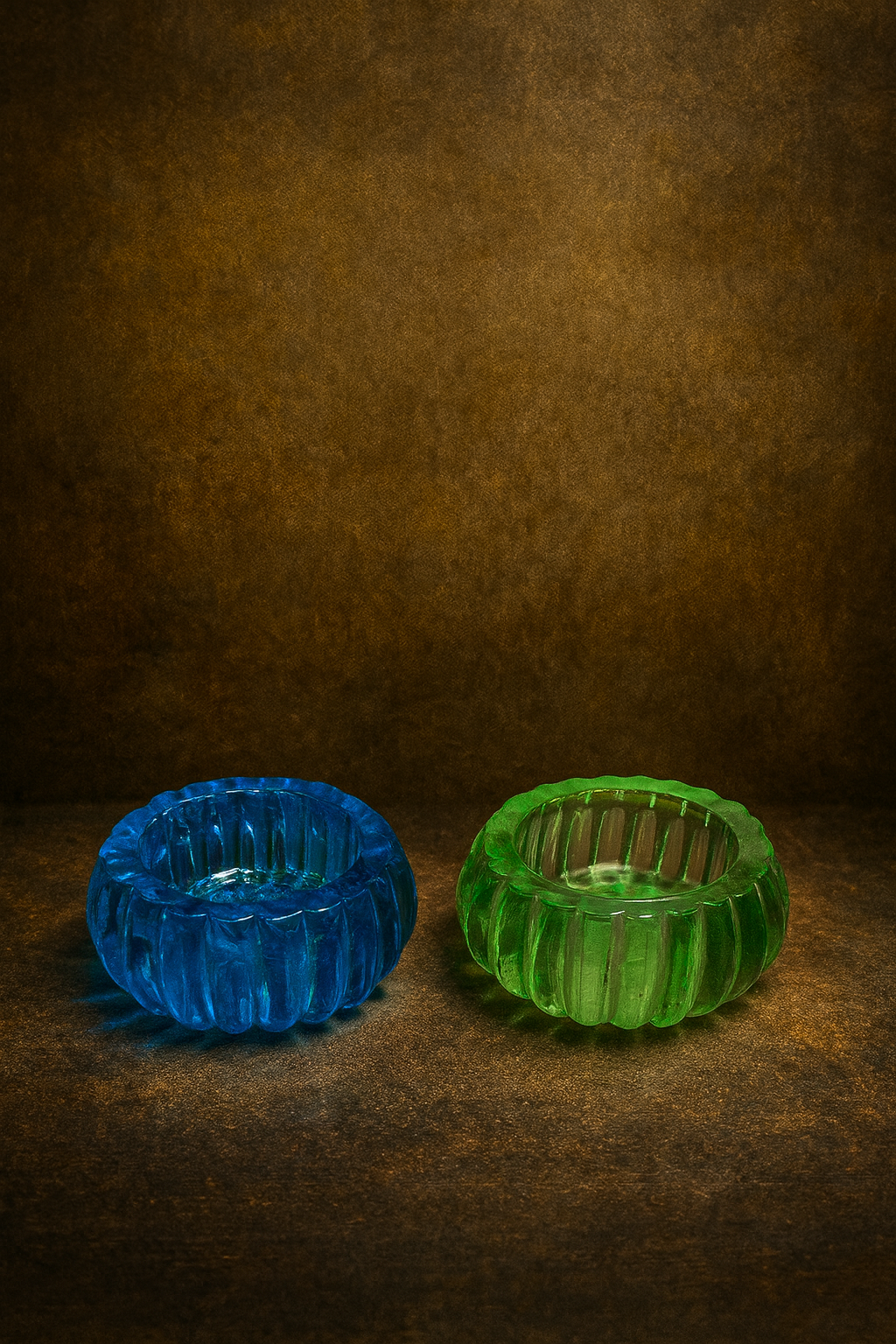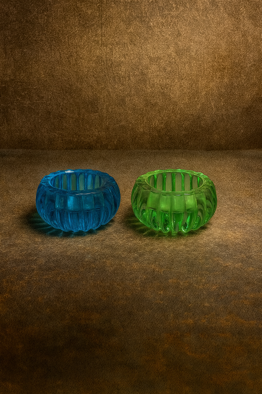 This set of vintage ribbed pressed glass bowls includes two beautifully coloured pieces in blue and green. Crafted with a ribbed texture that reflects traditional pressed glass design, these bowls are collectible and decorative. Pressed glassware like this was popular in earlier decades for both everyday use and tabletop display, and the coloured finishes add a charming aesthetic quality to any interior.