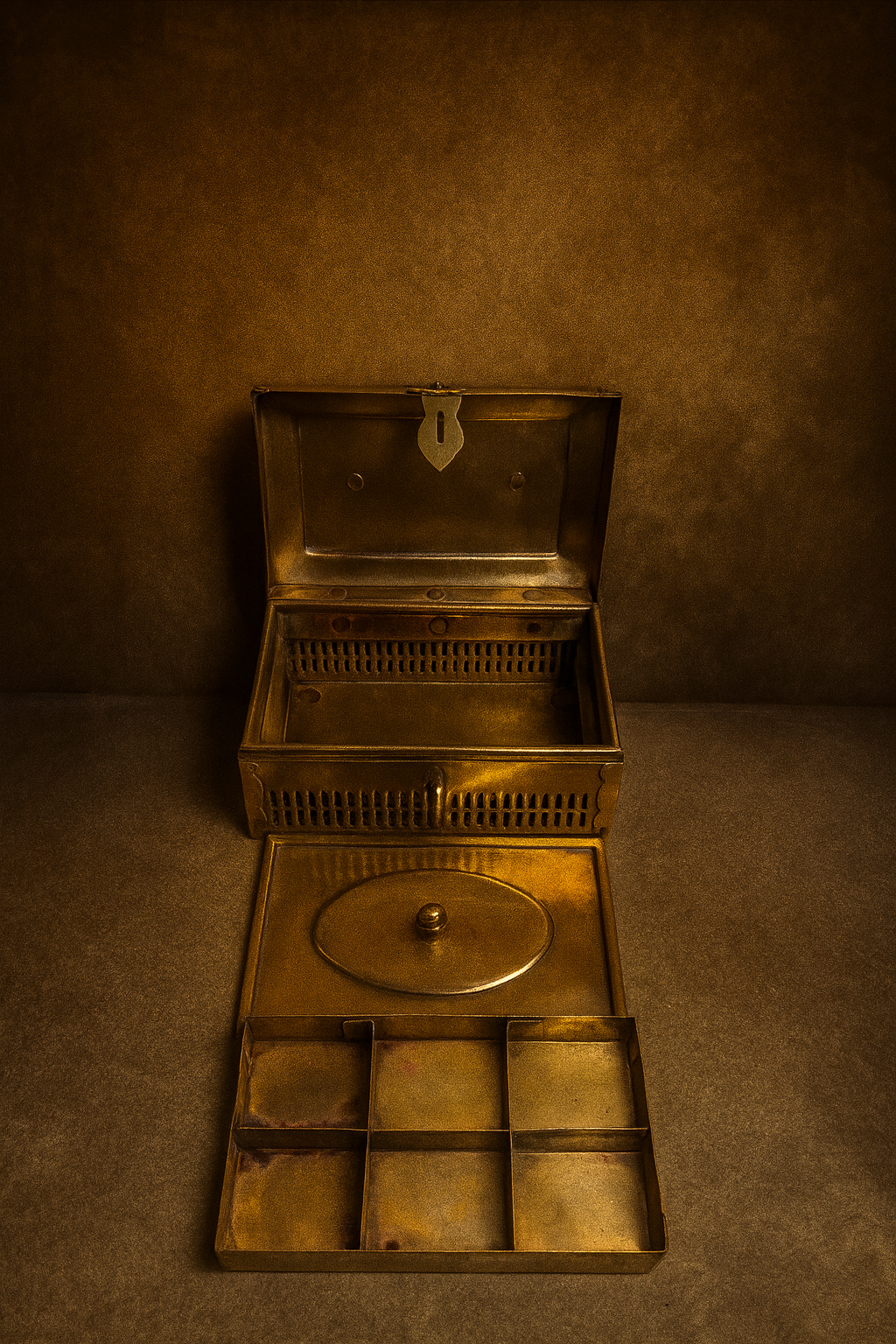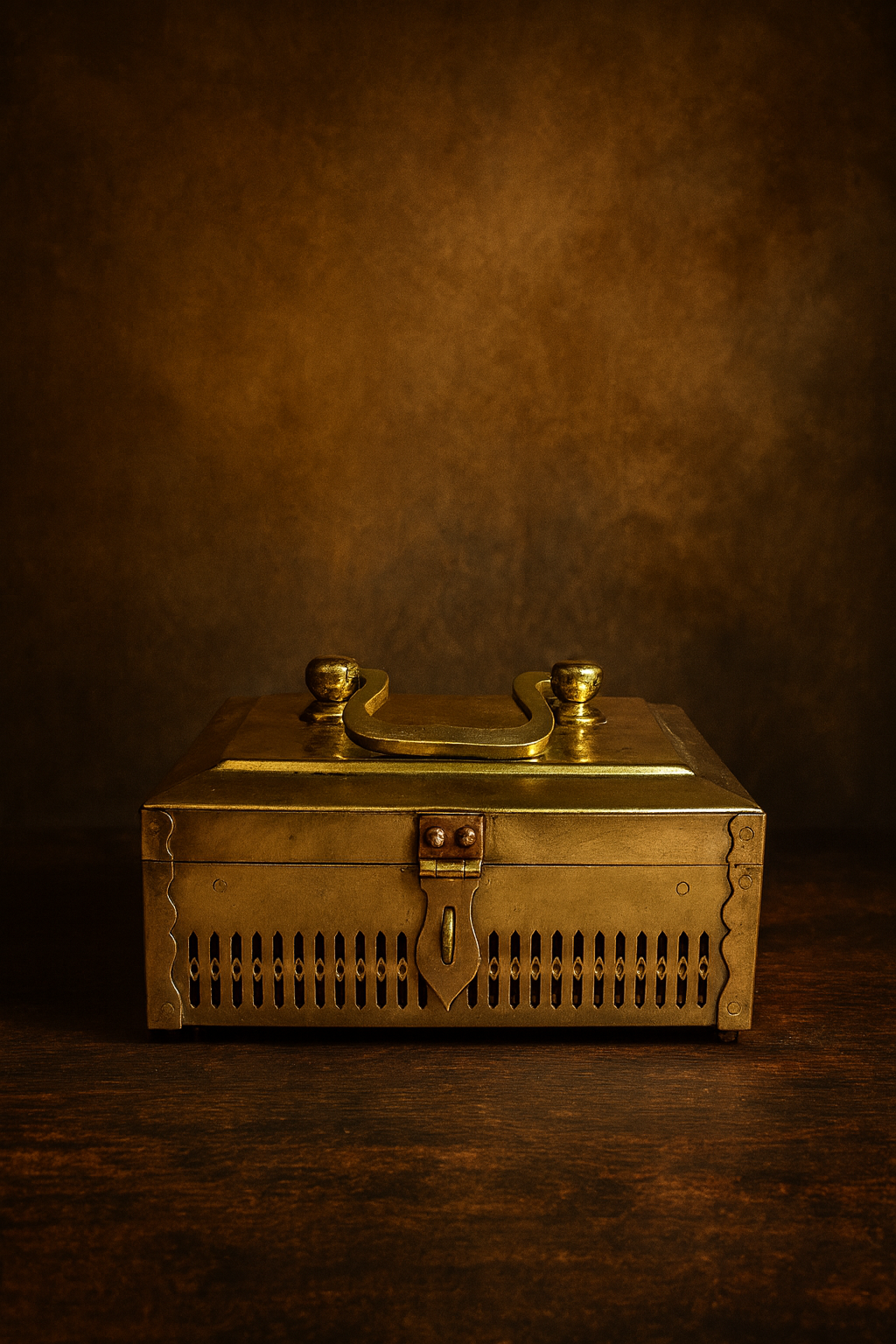 This antique solid brass Paan Daan carries with it the elegance, rituals, and royal charm of a bygone era. Once a staple in princely households, mehfils, and festive gatherings, this heritage paan box was meticulously designed to store betel leaves and their aromatic condiments in perfectly divided compartments.