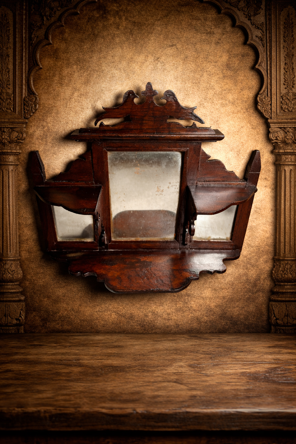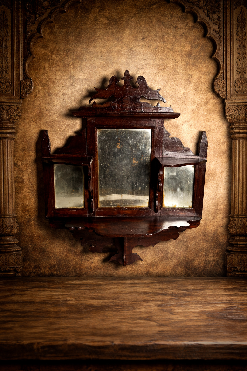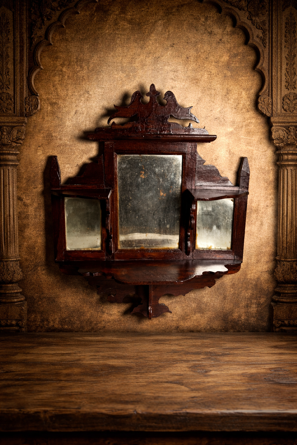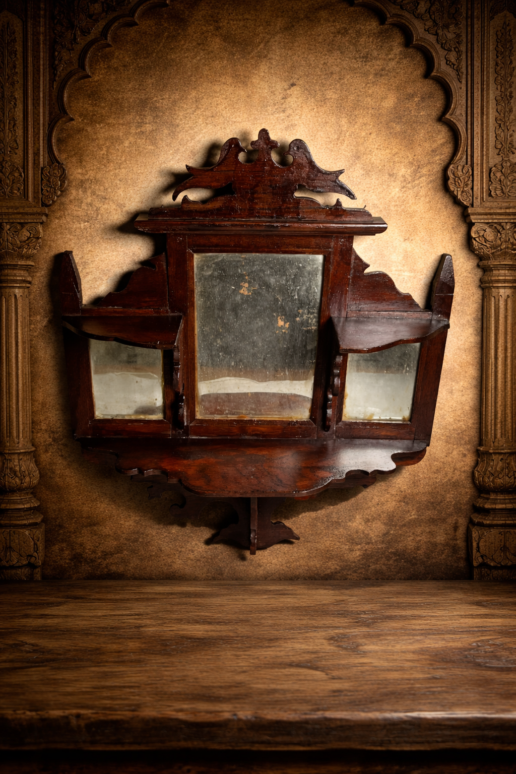 Bring home a rare blend of functionality and antique charm with this teak wood wall-hanging mirror cabinet featuring a beautiful 3-panel design.
