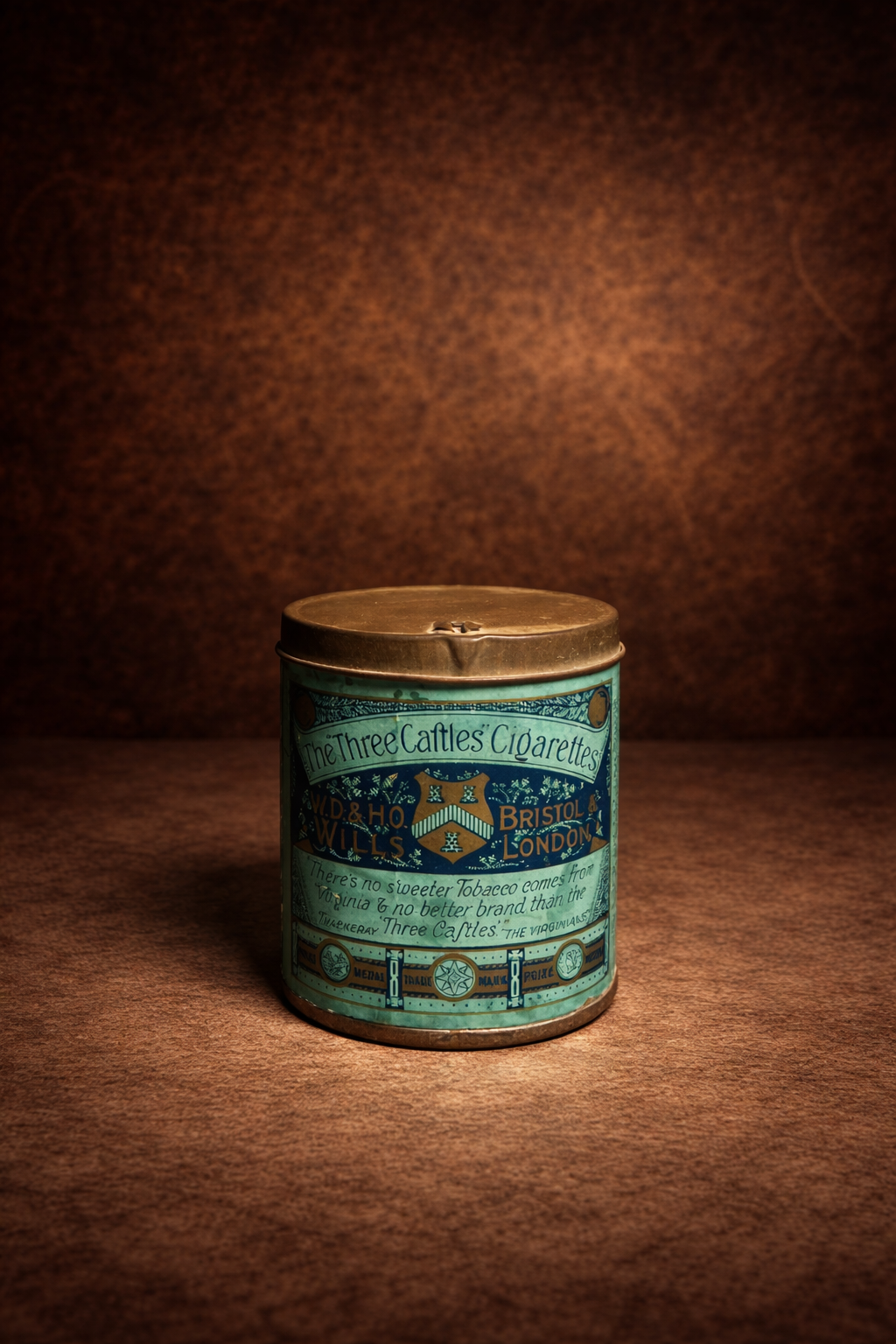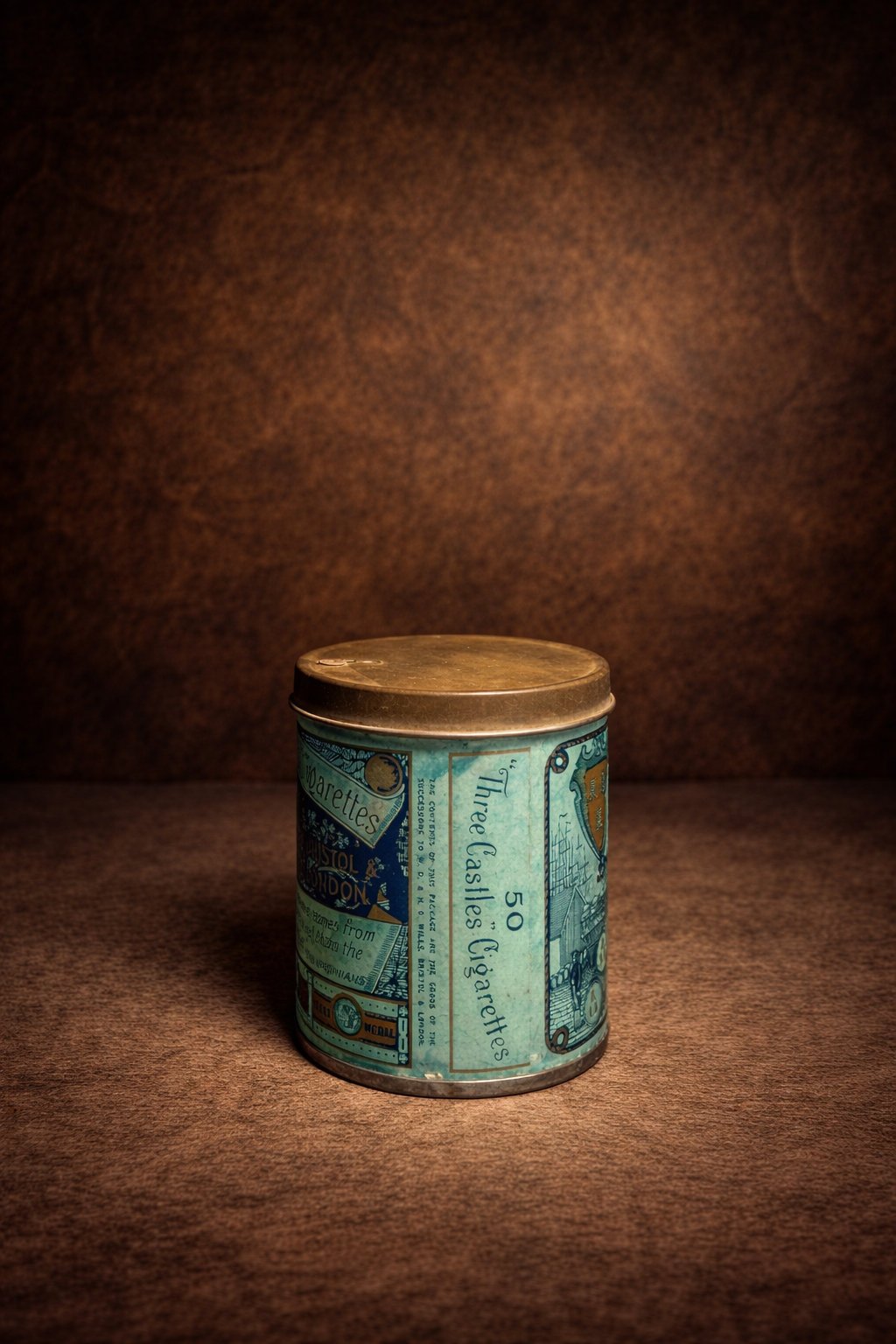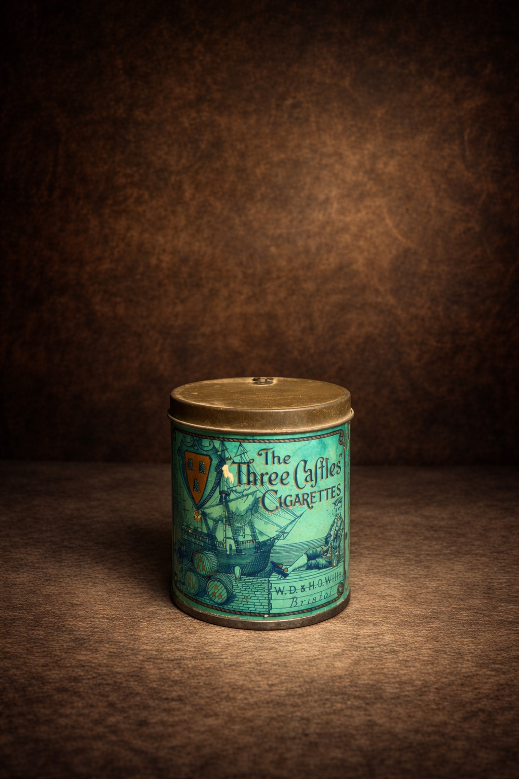 A truly elegant and collectible piece of British tobacco history, this original “The Three Castles” Cigarettes tin stands out with its unique teal-blue color palette and detailed maritime artwork.