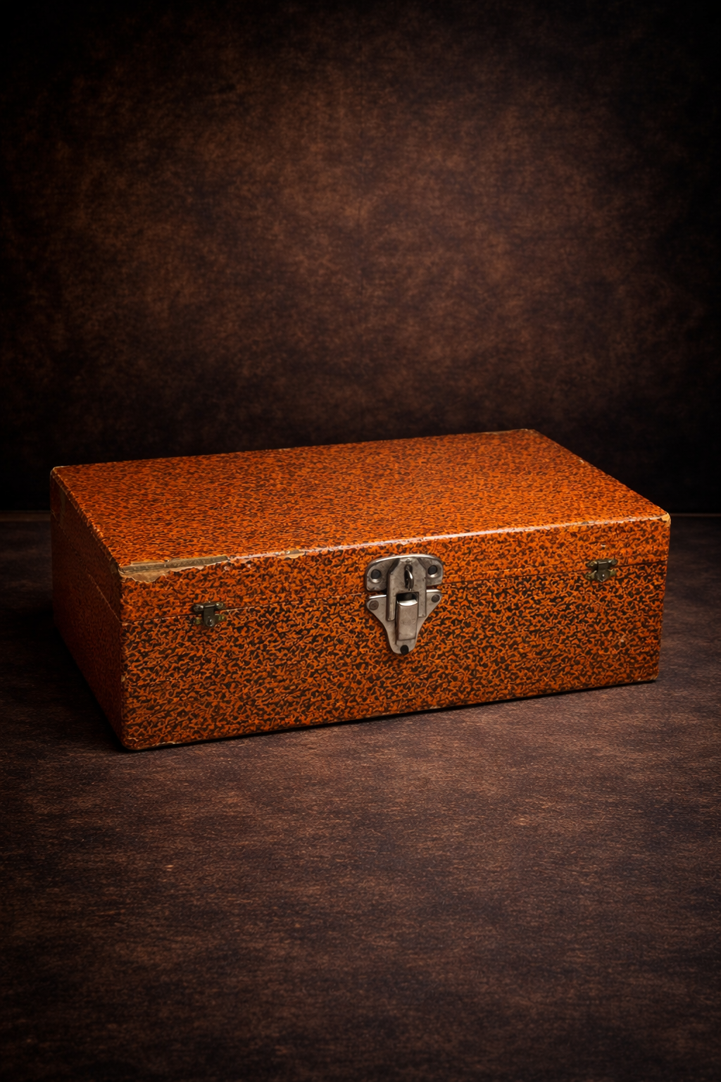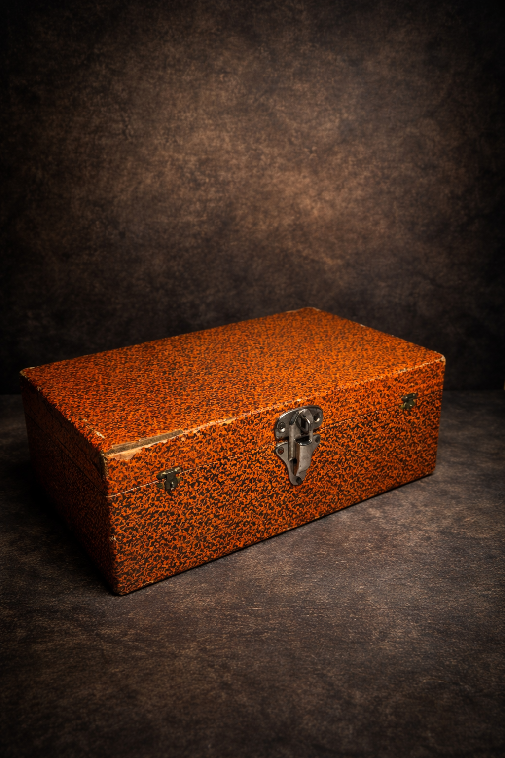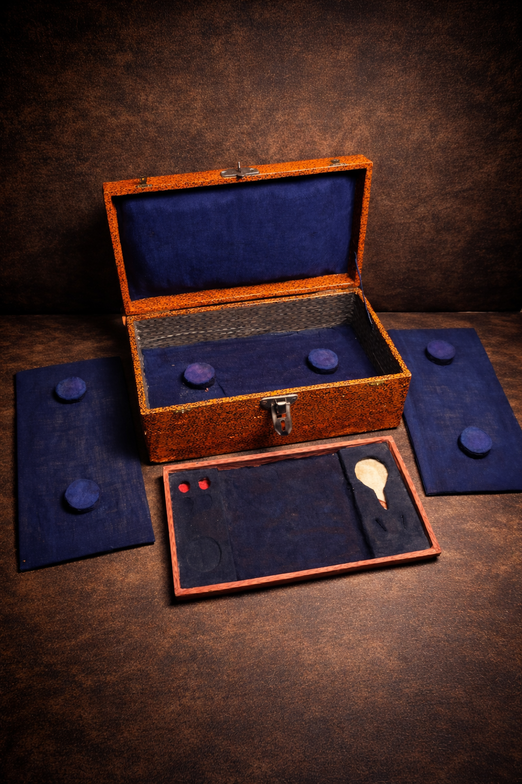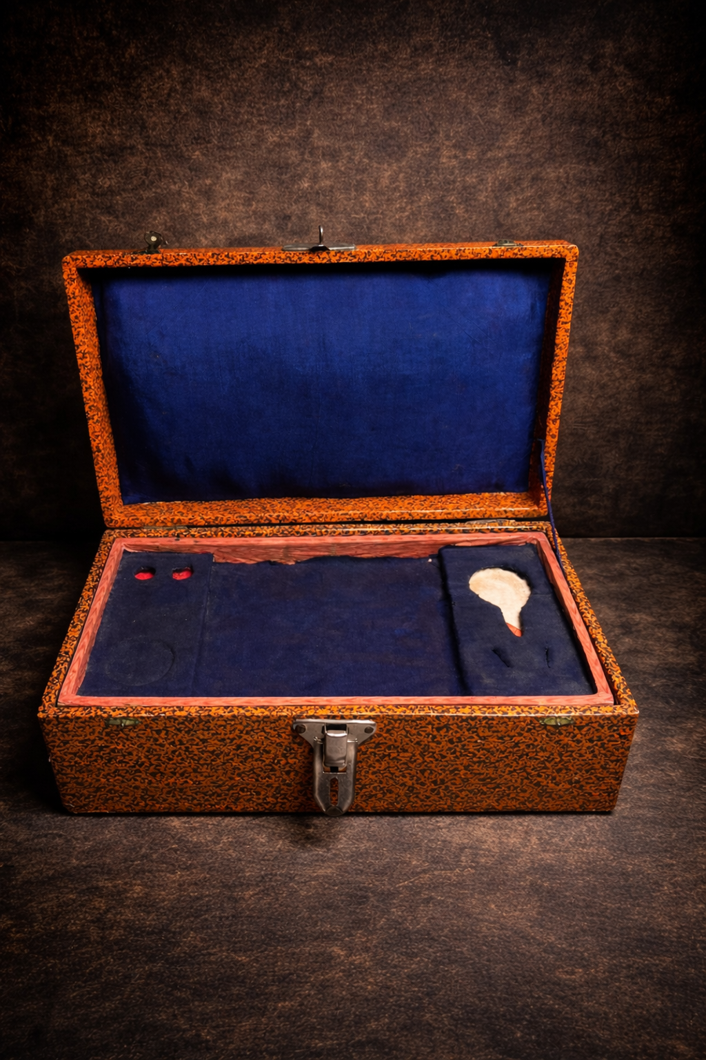 Its bold orange textured exterior paired with deep blue velvet interior gives it a striking antique aesthetic, making it both functional and decorative.