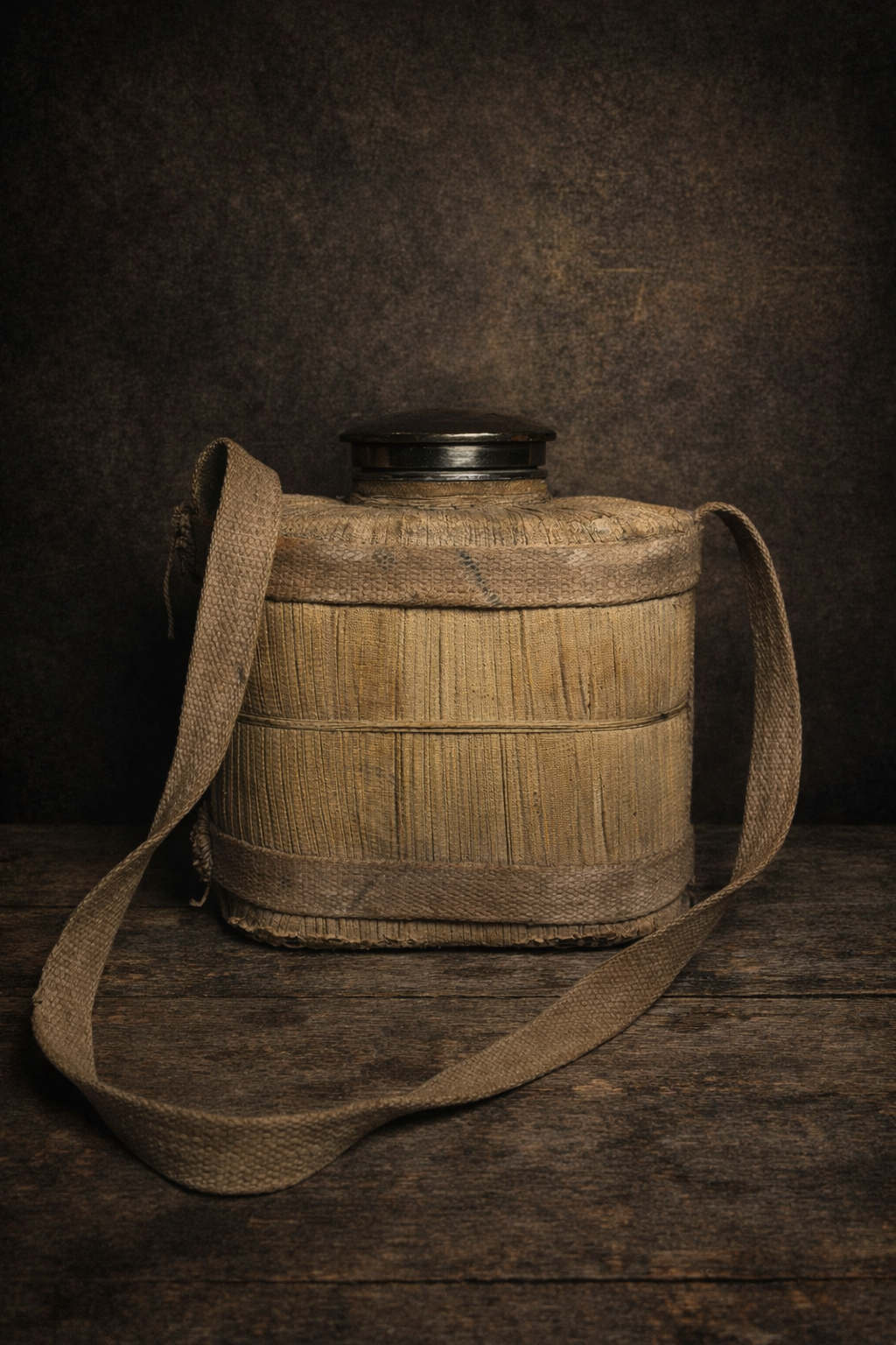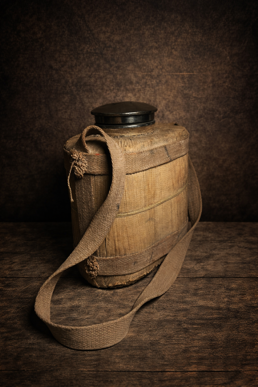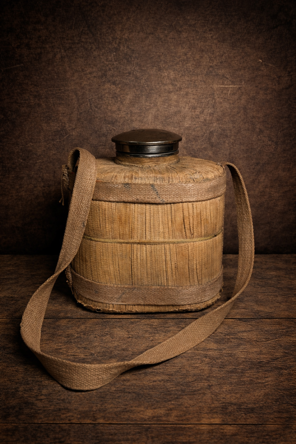 Yeh ek rare vintage woven canteen hai jo purane zamane me travel aur military use ke liye use hota tha. Iska bamboo / wooden woven body aur canvas strap isko ek strong rustic character deta hai.